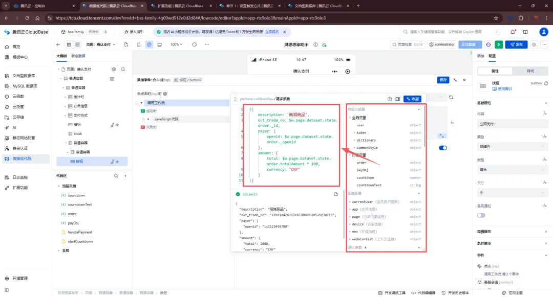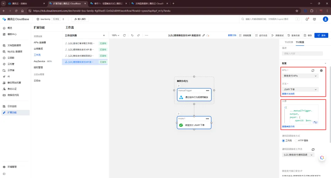 调用工作流成功之后,它会输出微信支付平台返回来的支付参数信息,直接在后面执行一段支付程序代码:
