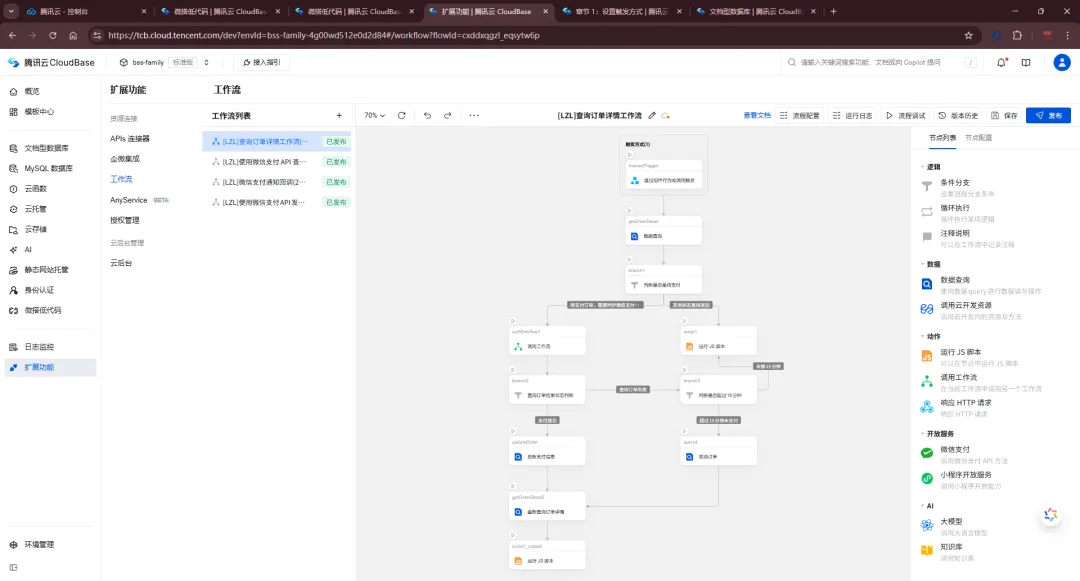 整个流程,用一行字来总结就是:小程序点击触发——调用工作流——工作流按流程图的方式执行任务——返回结果给小程序。