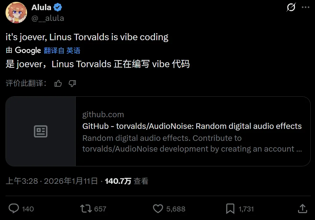 上周末,最著名程序员、Linux 作者 Linus Torvalds 发布 Vibe Coding 项目的消息让不少人始料未及。