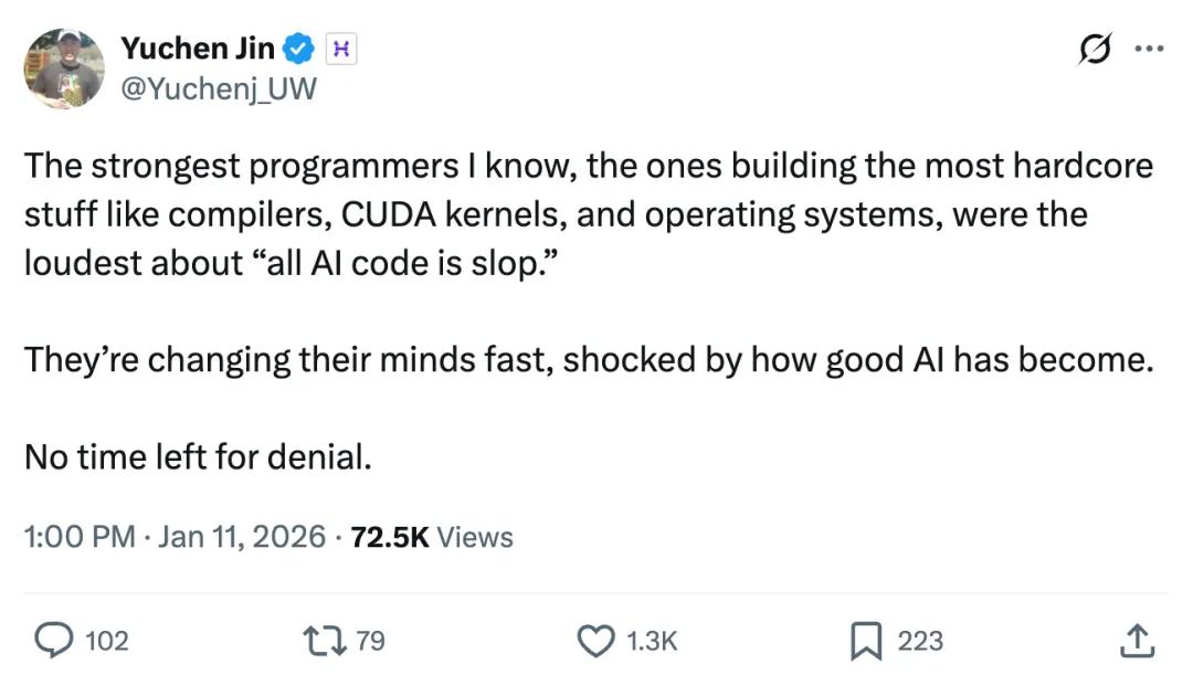 有人感叹,「我认识的最厉害程序员,包括那些构建编译器、CUDA 内核和操作系统等最核心功能的程序员,他们以前对「所有 AI 代码都是垃圾」的呼声最高。但如今,他们的想法正在迅速改变,并对 AI 的强大感到震惊。没有时间去否认这一点了。」