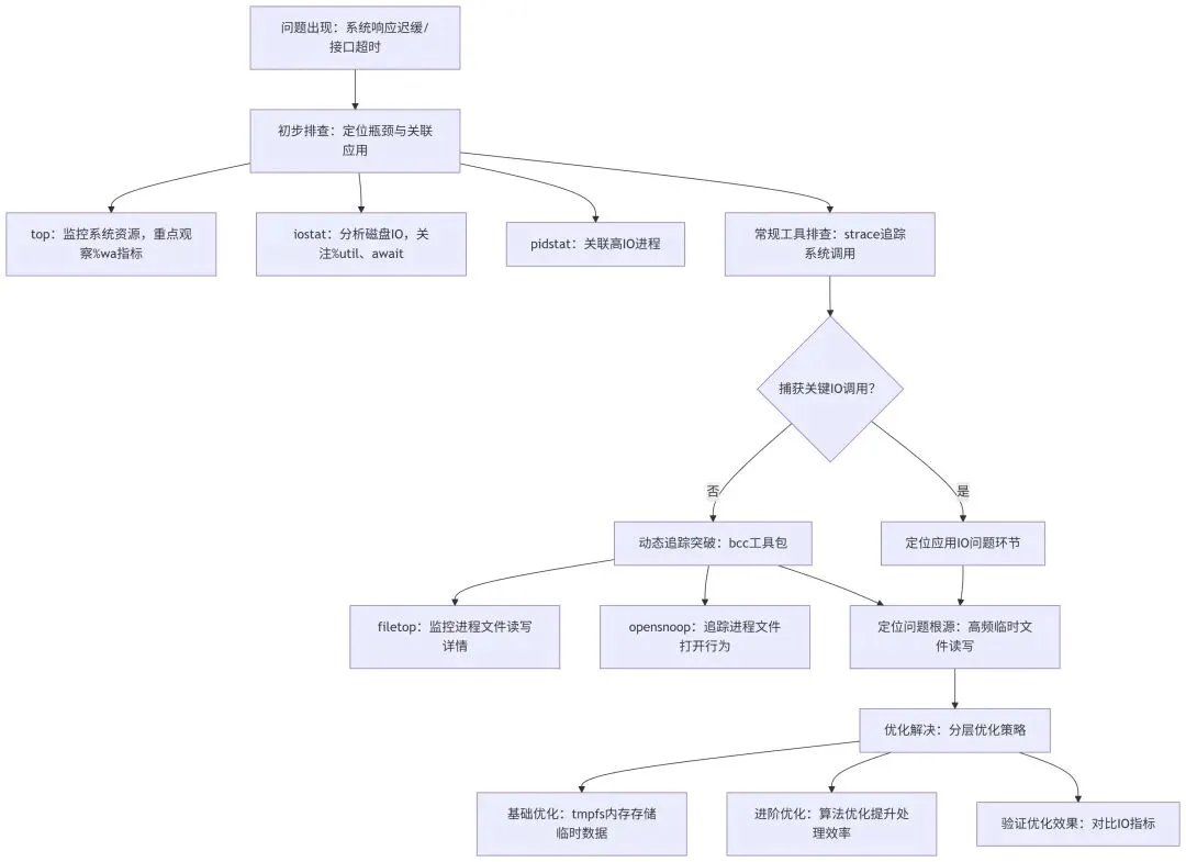其一,IO问题排查需避免单一工具依赖,应结合各类工具的优势形成互补(如本次通过top/iostat定位瓶颈、pidstat关联进程、strace初步追踪、bcc突破瓶颈);