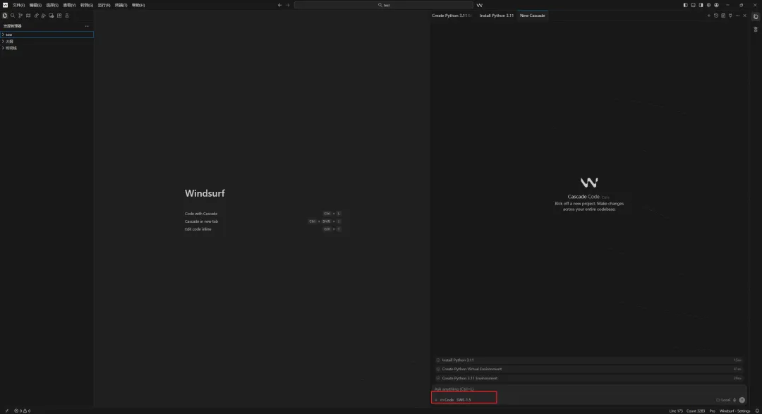 打开windsurf,为了防止修改我的本地项目,我新建了一个项目进行操作,并且选用了一个免费的AI,名叫SWE-1.5