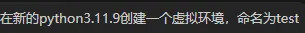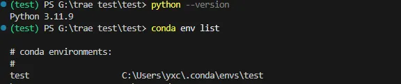 当环境创建好以后,在终端输入查询命令查看当前的python版本和虚拟环境。