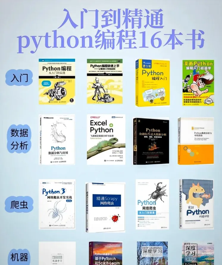 以上这16本Python蟒蛇书,希望能给入门 Python 的你带去全新的灵感,让 Python 的学习不再困难。