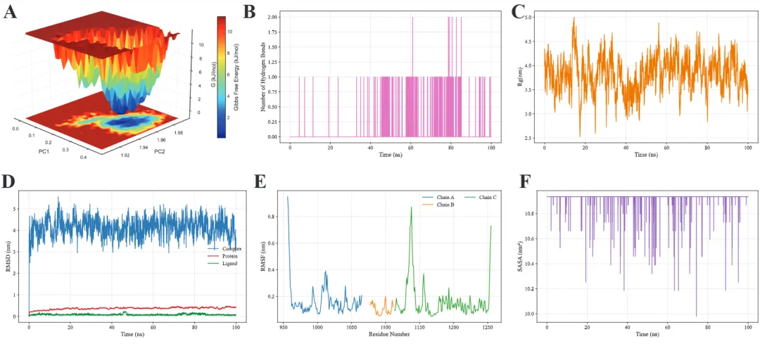 #!/usr/bin/env python3"""GROMACS轨迹分析(使用gmx工具)"""import osimport subprocessimport numpy as npimport matplotlib.pyplot as pltimport seaborn as snsplt.rcParams['font.family'] = 'Arial'plt.rcParams['font.size'] = 12plt.rcParams['axes.linewidth'] = 1.5class GMXAnalysis: def __init__(self, work_dir="gmx_output", output_dir="gmx_analysis"): self.work_dir = work_dir self.output_dir = output_dir os.makedirs(output_dir, exist_ok=True) def run_cmd(self, cmd): """运行命令""" result = subprocess.run(cmd, shell=True, capture_output=True, text=True, cwd=self.work_dir) return result def analyze_rmsd(self): """RMSD分析""" print("计算RMSD...") # 计算backbone RMSD self.run_cmd("echo '4\n4' | gmx rms -s md.tpr -f md_noPBC.xtc -o rmsd.xvg -tu ns") # 读取数据 data = np.loadtxt(f"{self.work_dir}/rmsd.xvg", comments=['@', '#']) time = data[:, 0] rmsd = data[:, 1] * 10 # nm to Å # 绘图 fig, ax = plt.subplots(figsize=(8, 5), dpi=300) ax.plot(time, rmsd, linewidth=1.5, color='#2E86AB') ax.set_xlabel('Time (ns)', fontsize=14, fontweight='bold') ax.set_ylabel('RMSD (Å)', fontsize=14, fontweight='bold') ax.set_title('Backbone RMSD', fontsize=16, fontweight='bold') ax.grid(True, alpha=0.3, linestyle='--') ax.spines['top'].set_visible(False) ax.spines['right'].set_visible(False) plt.tight_layout() plt.savefig(f'{self.output_dir}/rmsd.png', dpi=300, bbox_inches='tight') plt.savefig(f'{self.output_dir}/rmsd.pdf', bbox_inches='tight') plt.close() print("✓ RMSD完成") def analyze_rmsf(self): """RMSF分析""" print("计算RMSF...") # 计算C-alpha RMSF self.run_cmd("echo '3' | gmx rmsf -s md.tpr -f md_noPBC.xtc -o rmsf.xvg -res") # 读取数据 data = np.loadtxt(f"{self.work_dir}/rmsf.xvg", comments=['@', '#']) residues = data[:, 0] rmsf = data[:, 1] * 10 # nm to Å # 绘图 fig, ax = plt.subplots(figsize=(10, 5), dpi=300) ax.plot(residues, rmsf, linewidth=2, color='#A23B72') ax.fill_between(residues, rmsf, alpha=0.3, color='#A23B72') ax.set_xlabel('Residue Number', fontsize=14, fontweight='bold') ax.set_ylabel('RMSF (Å)', fontsize=14, fontweight='bold') ax.set_title('C-alpha RMSF', fontsize=16, fontweight='bold') ax.grid(True, alpha=0.3, linestyle='--') ax.spines['top'].set_visible(False) ax.spines['right'].set_visible(False) plt.tight_layout() plt.savefig(f'{self.output_dir}/rmsf.png', dpi=300, bbox_inches='tight') plt.savefig(f'{self.output_dir}/rmsf.pdf', bbox_inches='tight') plt.close() print("✓ RMSF完成") def analyze_rg(self): """回旋半径""" print("计算Rg...") # 计算Rg self.run_cmd("echo '1' | gmx gyrate -s md.tpr -f md_noPBC.xtc -o gyrate.xvg") # 读取数据 data = np.loadtxt(f"{self.work_dir}/gyrate.xvg", comments=['@', '#']) time = data[:, 0] rg = data[:, 1] * 10 # nm to Å # 绘图 fig, ax = plt.subplots(figsize=(8, 5), dpi=300) ax.plot(time, rg, linewidth=1.5, color='#F18F01') ax.set_xlabel('Time (ns)', fontsize=14, fontweight='bold') ax.set_ylabel('Radius of Gyration (Å)', fontsize=14, fontweight='bold') ax.set_title('Radius of Gyration', fontsize=16, fontweight='bold') ax.axhline(y=np.mean(rg), color='red', linestyle='--', linewidth=1.5, label=f'Mean: {np.mean(rg):.2f} Å', alpha=0.7) ax.legend(frameon=False) ax.grid(True, alpha=0.3, linestyle='--') ax.spines['top'].set_visible(False) ax.spines['right'].set_visible(False) plt.tight_layout() plt.savefig(f'{self.output_dir}/rg.png', dpi=300, bbox_inches='tight') plt.savefig(f'{self.output_dir}/rg.pdf', bbox_inches='tight') plt.close() print("✓ Rg完成") def analyze_sasa(self): """溶剂可及表面积""" print("计算SASA...") # 计算SASA self.run_cmd("echo '1' | gmx sasa -s md.tpr -f md_noPBC.xtc -o sasa.xvg -tu ns") # 读取数据 data = np.loadtxt(f"{self.work_dir}/sasa.xvg", comments=['@', '#']) time = data[:, 0] sasa = data[:, 1] * 100 # nm^2 to Å^2 # 绘图 fig, ax = plt.subplots(figsize=(8, 5), dpi=300) ax.plot(time, sasa, linewidth=1.5, color='#06A77D') ax.set_xlabel('Time (ns)', fontsize=14, fontweight='bold') ax.set_ylabel('SASA (Ų)', fontsize=14, fontweight='bold') ax.set_title('Solvent Accessible Surface Area', fontsize=16, fontweight='bold') ax.grid(True, alpha=0.3, linestyle='--') ax.spines['top'].set_visible(False) ax.spines['right'].set_visible(False) plt.tight_layout() plt.savefig(f'{self.output_dir}/sasa.png', dpi=300, bbox_inches='tight') plt.savefig(f'{self.output_dir}/sasa.pdf', bbox_inches='tight') plt.close() print("✓ SASA完成") def analyze_hbonds(self): """氢键分析""" print("分析氢键...") # 蛋白内部氢键 self.run_cmd("echo '1\n1' | gmx hbond -s md.tpr -f md_noPBC.xtc -num hbond.xvg -tu ns") # 读取数据 data = np.loadtxt(f"{self.work_dir}/hbond.xvg", comments=['@', '#']) time = data[:, 0] hbonds = data[:, 1] # 绘图 fig, ax = plt.subplots(figsize=(8, 5), dpi=300) ax.plot(time, hbonds, linewidth=1.5, color='#D62839') ax.set_xlabel('Time (ns)', fontsize=14, fontweight='bold') ax.set_ylabel('Number of H-bonds', fontsize=14, fontweight='bold') ax.set_title('Hydrogen Bonds', fontsize=16, fontweight='bold') ax.axhline(y=np.mean(hbonds), color='blue', linestyle='--', linewidth=1.5, label=f'Mean: {np.mean(hbonds):.1f}', alpha=0.7) ax.legend(frameon=False) ax.grid(True, alpha=0.3, linestyle='--') ax.spines['top'].set_visible(False) ax.spines['right'].set_visible(False) plt.tight_layout() plt.savefig(f'{self.output_dir}/hbonds.png', dpi=300, bbox_inches='tight') plt.savefig(f'{self.output_dir}/hbonds.pdf', bbox_inches='tight') plt.close() print("✓ 氢键分析完成") def analyze_dssp(self): """二级结构分析""" print("分析二级结构...") # DSSP分析 self.run_cmd("echo '1' | gmx do_dssp -s md.tpr -f md_noPBC.xtc -o ss.xpm -sc scount.xvg -tu ns") # 读取二级结构统计 data = np.loadtxt(f"{self.work_dir}/scount.xvg", comments=['@', '#']) time = data[:, 0] # 绘图 fig, ax = plt.subplots(figsize=(10, 5), dpi=300) labels = ['Structure', 'Coil', 'β-Sheet', 'β-Bridge', 'Bend', 'Turn', 'α-Helix', '5-Helix', '3-Helix'] colors = ['#E63946', '#F1FAEE', '#A8DADC', 