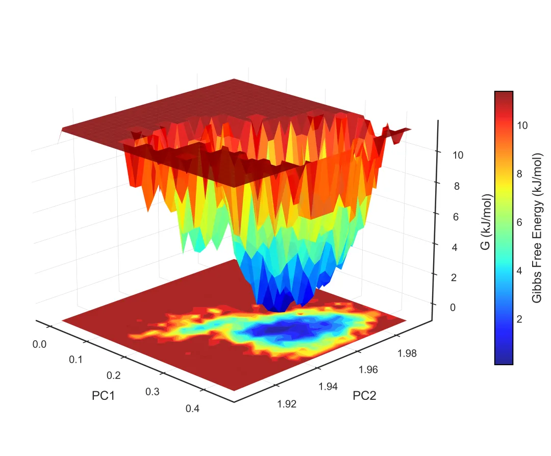#!/usr/bin/env python3"""MD轨迹分析和SCI级别可视化生成RMSD, RMSF, Rg, SASA, 2D/3D能量景观等图"""import mdtraj as mdimport numpy as npimport matplotlib.pyplot as pltfrom matplotlib import cmfrom mpl_toolkits.mplot3d import Axes3Dimport seaborn as snsfrom scipy.spatial.distance import pdist, squareformfrom sklearn.decomposition import PCAimport warningswarnings.filterwarnings('ignore')# SCI级别图表设置plt.rcParams['font.family'] = 'Arial'plt.rcParams['font.size'] = 12plt.rcParams['axes.linewidth'] = 1.5plt.rcParams['xtick.major.width'] = 1.5plt.rcParams['ytick.major.width'] = 1.5class MDAnalysis: def __init__(self, topology, trajectory, output_dir="analysis"): self.traj = md.load(trajectory, top=topology) self.output_dir = output_dir import os os.makedirs(output_dir, exist_ok=True) def calculate_rmsd(self, reference=0, selection='protein'): """计算RMSD""" print("计算RMSD...") atom_indices = self.traj.topology.select(selection) rmsd = md.rmsd(self.traj, self.traj, reference, atom_indices=atom_indices) * 10 # nm to Å time = self.traj.time / 1000 # ps to ns # 绘制RMSD fig, ax = plt.subplots(figsize=(8, 5), dpi=300) ax.plot(time, rmsd, linewidth=1.5, color='#2E86AB', alpha=0.8) ax.set_xlabel('Time (ns)', fontsize=14, fontweight='bold') ax.set_ylabel('RMSD (Å)', fontsize=14, fontweight='bold') ax.set_title('Backbone RMSD', fontsize=16, fontweight='bold') ax.grid(True, alpha=0.3, linestyle='--') ax.spines['top'].set_visible(False) ax.spines['right'].set_visible(False) plt.tight_layout() plt.savefig(f'{self.output_dir}/rmsd.png', dpi=300, bbox_inches='tight') plt.savefig(f'{self.output_dir}/rmsd.pdf', bbox_inches='tight') plt.close() print(f"✓ RMSD图已保存") return rmsd def calculate_rmsf(self, selection='protein and name CA'): """计算RMSF""" print("计算RMSF...") atom_indices = self.traj.topology.select(selection) rmsf = md.rmsf(self.traj, self.traj, atom_indices) * 10 # nm to Å residue_ids = [self.traj.topology.atom(i).residue.resSeq for i in atom_indices] # 绘制RMSF fig, ax = plt.subplots(figsize=(10, 5), dpi=300) ax.plot(residue_ids, rmsf, linewidth=2, color='#A23B72') ax.fill_between(residue_ids, rmsf, alpha=0.3, color='#A23B72') ax.set_xlabel('Residue Number', fontsize=14, fontweight='bold') ax.set_ylabel('RMSF (Å)', fontsize=14, fontweight='bold') ax.set_title('C-alpha RMSF', fontsize=16, fontweight='bold') ax.grid(True, alpha=0.3, linestyle='--') ax.spines['top'].set_visible(False) ax.spines['right'].set_visible(False) plt.tight_layout() plt.savefig(f'{self.output_dir}/rmsf.png', dpi=300, bbox_inches='tight') plt.savefig(f'{self.output_dir}/rmsf.pdf', bbox_inches='tight') plt.close() print(f"✓ RMSF图已保存") return rmsf def calculate_rg(self, selection='protein'): """计算回旋半径""" print("计算回旋半径...") atom_indices = self.traj.topology.select(selection) rg = md.compute_rg(self.traj, atom_indices=atom_indices) * 10 # nm to Å time = self.traj.time / 1000 # 绘制Rg fig, ax = plt.subplots(figsize=(8, 5), dpi=300) ax.plot(time, rg, linewidth=1.5, color='#F18F01', alpha=0.8) ax.set_xlabel('Time (ns)', fontsize=14, fontweight='bold') ax.set_ylabel('Radius of Gyration (Å)', fontsize=14, fontweight='bold') ax.set_title('Radius of Gyration', fontsize=16, fontweight='bold') ax.grid(True, alpha=0.3, linestyle='--') ax.spines['top'].set_visible(False) ax.spines['right'].set_visible(False) # 添加平均线 ax.axhline(y=np.mean(rg), color='red', linestyle='--', linewidth=1.5, label=f'Mean: {np.mean(rg):.2f} Å', alpha=0.7) ax.legend(frameon=False) plt.tight_layout() plt.savefig(f'{self.output_dir}/rg.png', dpi=300, bbox_inches='tight') plt.savefig(f'{self.output_dir}/rg.pdf', bbox_inches='tight') plt.close() print(f"✓ Rg图已保存") return rg def calculate_sasa(self, selection='protein'): """计算溶剂可及表面积""" print("计算SASA...") atom_indices = self.traj.topology.select(selection) sasa = md.shrake_rupley(self.traj, mode='residue') total_sasa = np.sum(sasa, axis=1) * 100 # nm^2 to Å^2 time = self.traj.time / 1000 # 绘制SASA fig, ax = plt.subplots(figsize=(8, 5), dpi=300) ax.plot(time, total_sasa, linewidth=1.5, color='#06A77D', alpha=0.8) ax.set_xlabel('Time (ns)', fontsize=14, fontweight='bold') ax.set_ylabel('SASA (Ų)', fontsize=14, fontweight='bold') ax.set_title('Solvent Accessible Surface Area', fontsize=16, fontweight='bold') ax.grid(True, alpha=0.3, linestyle='--') ax.spines['top'].set_visible(False) ax.spines['right'].set_visible(False) plt.tight_layout() plt.savefig(f'{self.output_dir}/sasa.png', dpi=300, bbox_inches='tight') plt.savefig(f'{self.output_dir}/sasa.pdf', bbox_inches='tight') plt.close() print(f"✓ SASA图已保存") return total_sasa def free_energy_landscape_2d(self, selection='protein and name CA'): """2D自由能景观图(PCA前两个主成分)""" print("生成2D自由能景观...") atom_indices = self.traj.topology.select(selection) # 提取坐标并展平 xyz = self.traj.atom_slice(atom_indices).xyz n_frames, n_atoms, _ = xyz.shape xyz_flat = xyz.reshape(n_frames, n_atoms * 3) # PCA降维 pca = PCA(n_components=2) pc = pca.fit_transform(xyz_flat) # 计算2D直方图(概率分布) H, xedges, yedges = np.histogram2d(pc[:, 0], pc[:, 1], bins=50) # 转换为自由能 (kT单位) kT = 0.593 # kcal/mol at 300K H[H == 0] = 1e-10 # 避免log(0) free_energy = -kT * np.log(H.T) free_energy -= free_energy.min() # 最小值归零 # 绘制2D等高线图 fig, ax = plt.subplots(figsize=(8, 7), dpi=300) X, Y = np.meshgrid(xedges[:-1], yedges[:-1]) contourf = ax.contourf(X, Y, free_energy, levels=20, cmap='jet') contour = ax.contour(X, Y, free_energy, levels=10, colors='black', linewidths=0.5, alpha=0.4) cbar = plt.colorbar(contourf, ax=ax) cbar.set_label('Free Energy (kcal/mol)', fontsize=12, fontweight='bold') ax.set_xlabel(f'PC1 ({pca.explained_variance_ratio_[0]*100:.1f}%)', fontsize=14, fontweight='bold') ax.set_ylabel(f'PC2 ({pca.explained_variance_ratio_[1]*100:.1f}%)', fontsize=14, fontweight