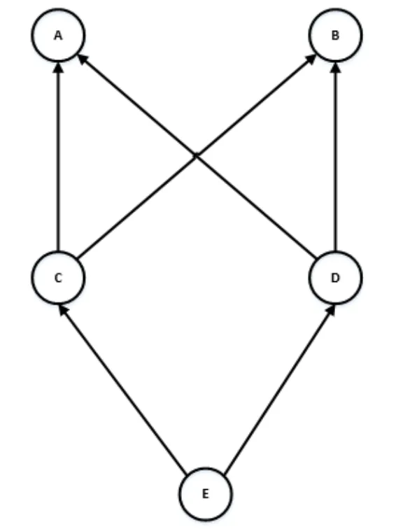 在我们调用E.test()时,在类A和类B中都存在这个方法。但是由于在多重继承中遵循广度优先的方式(先探索节点级数较浅的节点),所以程序最先搜索类E,然后再搜索类C和类D。如果还没找到,再到类A中查找。若类A中存在这个方法,则调用这个方法,若在类A中也没有找到,则再到类B中查找。