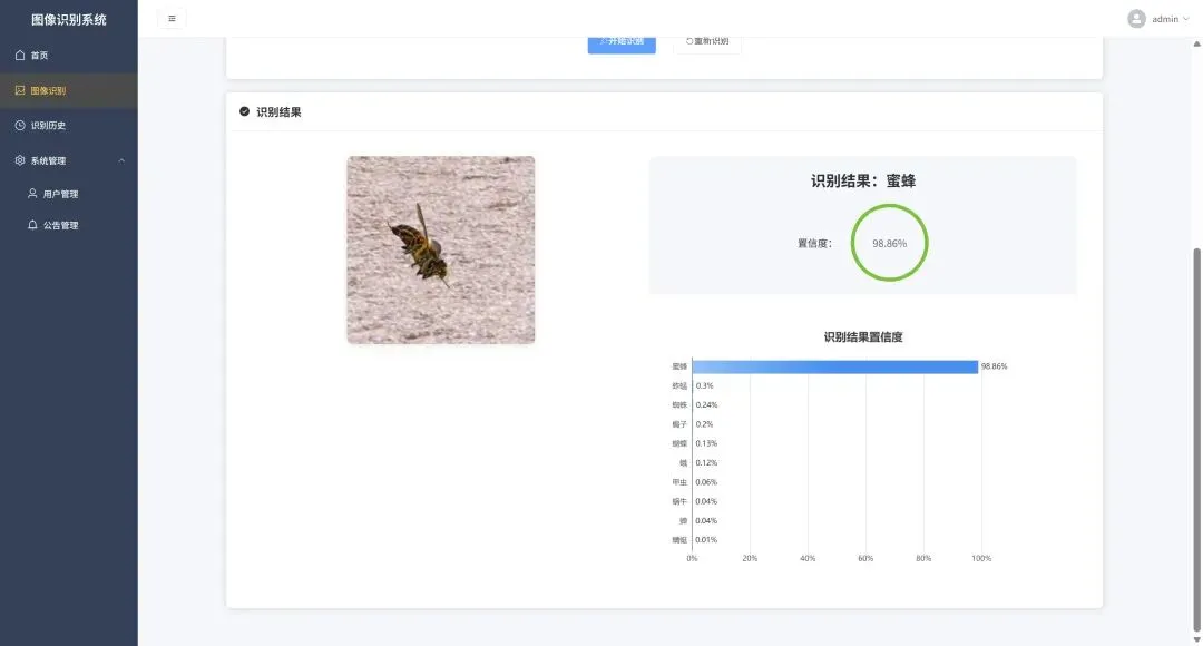本系统是一个基于深度学习的昆虫智能识别Web应用,旨在为用户提供便捷、高效的昆虫图像识别服务。系统采用B/S架构设计,前端通过Flask RESTful API与后端进行交互,后端集成TensorFlow深度学习框架和ResNet50预训练模型,实现对10种常见昆虫(蜜蜂、甲虫、蝴蝶、蝉、蜻蜓、蚱蜢、蛾、蝎子、蜗牛、蜘蛛)的精准识别。系统核心功能包括用户注册登录、图像上传识别、识别历史记录查询、用户管理以及公告发布等。用户上传昆虫图片后,系统将自动进行图像预处理、特征提取和分类预测,返回识别结果、置信度以及所有类别的预测概率,并将识别记录保存到数据库中供用户后续查看。系统采用JWT令牌认证机制保障用户数据安全,使用SQLite数据库存储用户信息、识别记录和公告数据,并通过Flask-Migrate实现数据库版本管理。整个系统具有良好的可扩展性和用户友好的交互体验。