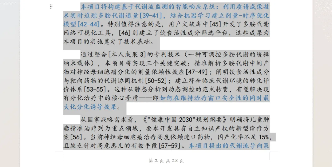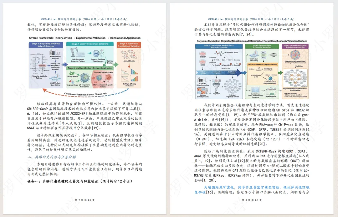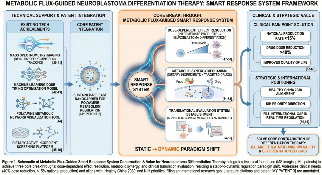 请以“基于多胺代谢调控的饮食-药物联合策略诱导神经母细胞瘤分化的关键机制与转化探索”为研究主题,辅助生成国家自然科学基金申请书的三大核心模块——立项依据(重点强化,占比优先)、研究内容、研究基础。创作需严格遵循国自然标书的学术严谨性、逻辑规范性,紧密结合以下核心背景信息,且在各模块适当位置自然引用文献(需标注“[文献序号]”占位符,明确引用场景与目的):一、核心背景信息(必须深度融入内容)1. 个人成果:①已发表5篇1区SCI论文:1篇聚焦多胺代谢调控与神经母细胞瘤分化相关研究(虚构核心结论需契合“多胺代谢靶点筛选/饮食-药物协同调控”方向,如“多胺代谢关键酶ODC1靶向调控对神经母细胞瘤分化表型的影响初探”),4篇为肿瘤代谢调控、饮食干预机制、药物靶向设计及肿瘤分化研究相关(核心技术聚焦多胺代谢通路解析、饮食活性成分筛选、小分子药物靶向修饰、肿瘤分化表型验证,突出技术在肿瘤代谢-治疗交叉领域的通用性与可迁移性);②拥有10项发明专利,围绕“多胺代谢关键靶点鉴定、饮食活性成分富集纯化、药物-饮食协同递送系统构建、神经母细胞瘤分化表型检测方法”方向,体现技术储备优势与转化潜力。2. 文献上传:已上传90余篇相关领域文献(不局限于多胺代谢与神经母细胞瘤,含肿瘤代谢调控、饮食-药物联合治疗、神经母细胞瘤分化机制、多胺代谢酶靶向药物等领域),需作为论证依据融入各模块。二、分模块具体要求(含文献引用规范)1. 立项依据(核心重点,文献引用密度最高):- 第一部分:研究现状梳理。系统阐述神经母细胞瘤分化治疗的研究进展(如现有分化诱导药物、治疗瓶颈),需引用神经母细胞瘤临床治疗与分化研究领域核心文献支撑结论(如“目前临床常用的神经母细胞瘤分化诱导药物存在靶向性差、耐药性显著等问题,仅对20%-30%患儿有效,整体疗效亟待提升[1-3]”);同时梳理多胺代谢调控机制、饮食-药物联合治疗策略在肿瘤领域的应用现状,引用多胺代谢、饮食干预相关文献(含肿瘤代谢与临床治疗交叉领域)论证技术成熟度与可行性(如“多胺代谢失衡与神经母细胞瘤恶性进展密切相关,靶向ODC1、SSAT等关键酶可显著抑制肿瘤增殖并诱导分化[4-6],为分化治疗提供了新靶点”)。- 第二部分:研究缺口与科学问题凝练。基于文献综述指出当前研究不足(如“多胺代谢调控神经母细胞瘤分化的下游分子网络尚未明确,饮食活性成分与靶向药物的协同作用机制缺乏系统性解析[7-9]”“现有联合治疗方案未针对多胺代谢通路进行精准设计,饮食干预的剂量与时序优化缺乏理论支撑[10]”),每个缺口均需配套文献支撑;结合个人1篇多胺代谢-神经母细胞瘤分化论文及4篇肿瘤代谢/治疗相关论文成果,引用个人成果对应的文献(标注“[本人成果1]”“[本人成果2-5]”),论证技术迁移合理性与研究延续性(如“本课题组前期证实多胺代谢抑制剂可上调神经母细胞瘤中分化相关标志物GFAP的表达[本人成果1],结合前期建立的饮食活性成分筛选体系[本人成果3],可进一步探索饮食-药物协同调控多胺代谢的分化诱导效应[11]”)。- 第三部分:课题意义论证。引用肿瘤精准治疗、儿童肿瘤诊疗相关政策/指南类文献(如“针对神经母细胞瘤的精准分化治疗符合《“健康中国2030”规划纲要》中儿童肿瘤规范化诊疗的核心目标,为高危患儿提供新的治疗路径[12]”),结合临床需求类文献说明研究的临床价值与科学意义,突出饮食-药物联合策略的安全性与转化潜力。2. 研究内容:- 围绕3-4个核心研究方向(如①神经母细胞瘤多胺代谢关键调控靶点的鉴定与功能验证;②饮食活性成分筛选及与靶向药物的协同分化效应评估;③饮食-药物联合调控多胺代谢诱导分化的分子机制解析;④联合策略的体内有效性与安全性验证及转化潜力探索)展开,每个研究方向需引用文献支撑技术路径的合理性。例如,在“协同分化效应评估”部分,引用文献说明饮食-药物联合的优势(如“饮食活性成分可通过调节代谢通路增强靶向药物的敏感性,降低药物毒副作用,在肿瘤联合治疗中展现出良好应用前景[13-14],本研究拟筛选可协同多胺代谢抑制剂的饮食活性成分”);在“靶点鉴定”部分,引用个人肿瘤代谢研究文献([本人成果2])及领域内经典文献,说明方法的可靠性。- 明确各研究内容的技术细节,且与个人专利技术衔接,必要时引用专利相关的技术验证文献(如“本研究采用的多胺代谢靶点快速鉴定方法,已通过专利技术验证,其靶点筛选准确率优于传统转录组学方法[本人专利1, 15]”)。3. 研究基础:- 学术成果支撑:拆解5篇1区论文时,每篇成果均需引用对应文献([本人成果1-5]),并关联领域内相关文献强化成果价值。例如,阐述多胺代谢-神经母细胞瘤相关论文时,引用该论文发表期刊的同领域文献([16-17]),说明研究结论的创新性与认可度;阐述肿瘤代谢/饮食干预论文时,引用多胺代谢调控、饮食-药物联合跨领域应用的文献([18-19]),支撑技术迁移的科学性。- 技术成果支撑:拆解10项发明专利时,引用专利对应的技术原理文献(含本人专利公开文献[本人专利1-10]及领域内同类技术文献[20-22]),明确专利技术在本课题中的应用场景及优势(如“本课题组研发的饮食活性成分富集纯化专利技术[本人专利5],其提取效率与纯度显著优于现有方法[21],可为本研究提供高质量