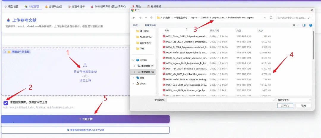 把我们刚刚在第三步下载的文献批量上传到我们的NSFC-Writer软件中,在上传文献之前还要做的一些准备工作,之前已经非常详细的介绍过,这里不再介绍。