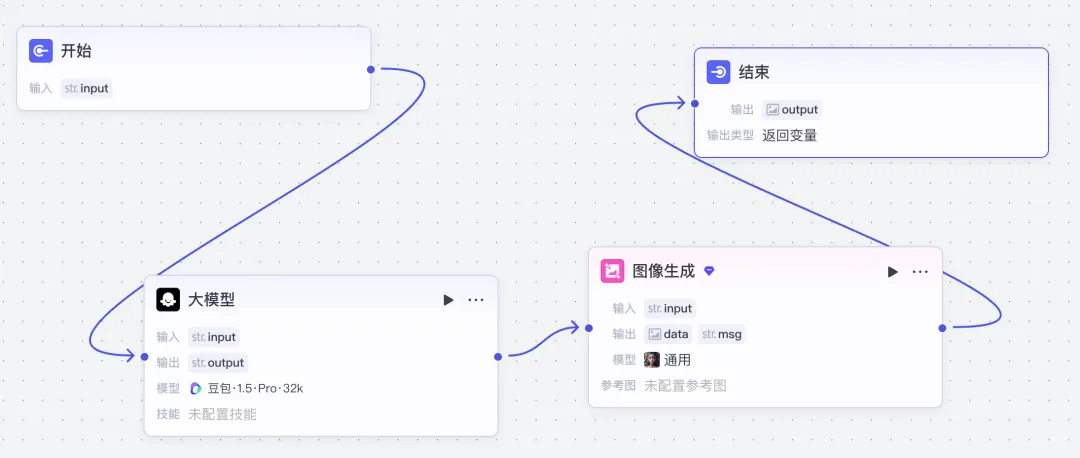 在画布上拖入 “开始”“大模型”“图像生成”“结束” 四个节点,按 “开始→大模型→图像生成→结束” 的顺序连接,就能实现 “接收输入→优化提示词→生成图像→输出结果” 的完整流程。