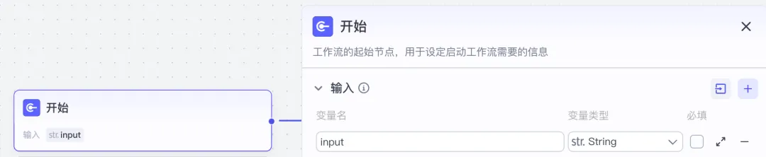 点击 “开始” 节点,在右侧输入栏添加一个名为 “input” 的变量,类型选 “String”这个变量用来接收用户输入的简单绘画关键词(比如 “一只猫”)。