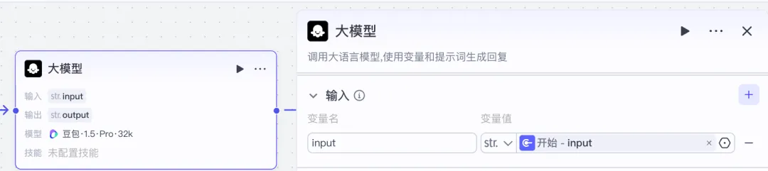 绑定输入:在 “输入” 栏,变量值选择 “开始 - input”,接收用户的原始关键词。