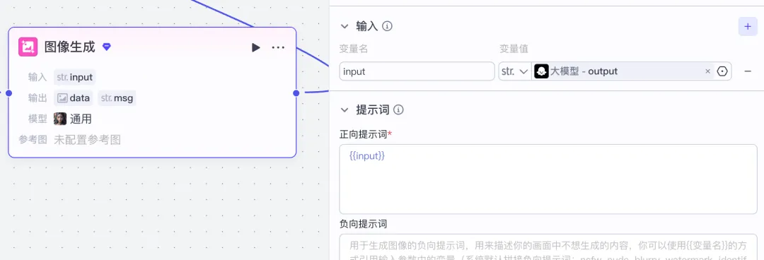 绑定提示词:在 “输入” 栏,变量值选择 “大模型 - output”,接收优化后的专业提示词;然后在 “提示词” 栏填 “{{input}}”,把优化后的内容传给绘图模型。