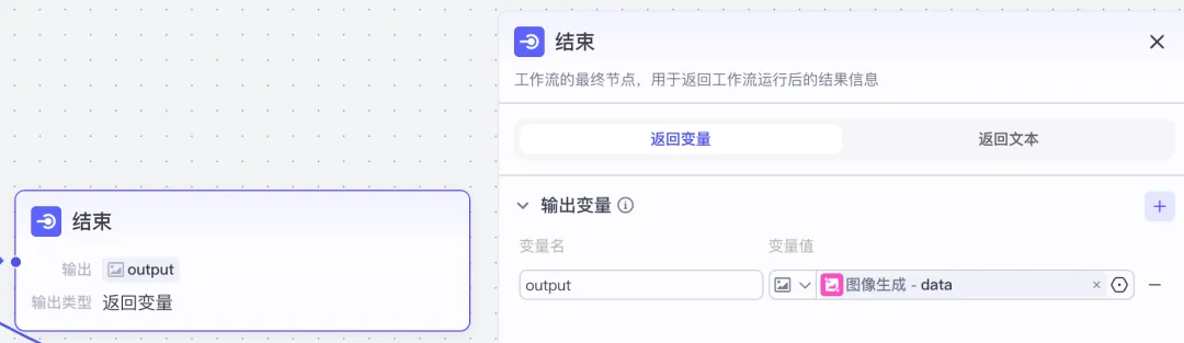 点击 “结束” 节点,在 “输出变量” 栏添加一个名为 “output” 的变量,变量值选择 “图像生成 - data”。这样工作流跑完后,就能直接输出生成好的图像链接或预览图。