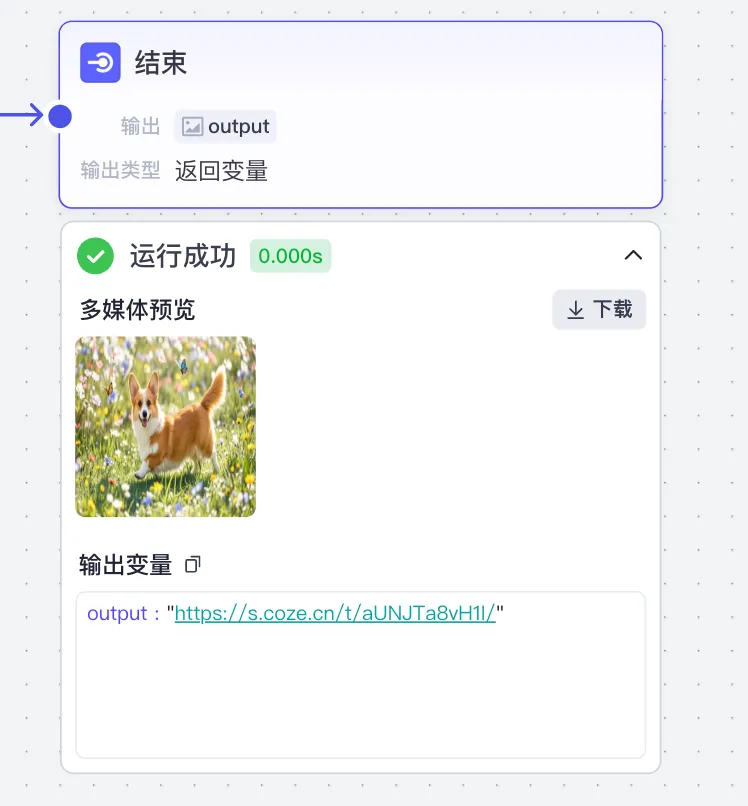 运行工作流时,只要在 “开始” 节点的输入框里填简单关键词(比如 “一只柯基”),系统会先把它优化成 “一只棕白相间的柯基犬,在开满野花的草地上奔跑,清新治愈风格,明亮的春日阳光,全景视角,8K 高清,细腻毛发质感”,再自动生成对应的高清图像。