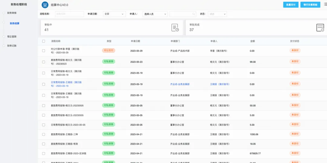系统通过与银企、第三方结算平台的对接,出纳在报销审批通过后可在“结算中心” 中一键批量付款,实现自动化的结算支付,避免人工操作造成的资金支付风险;