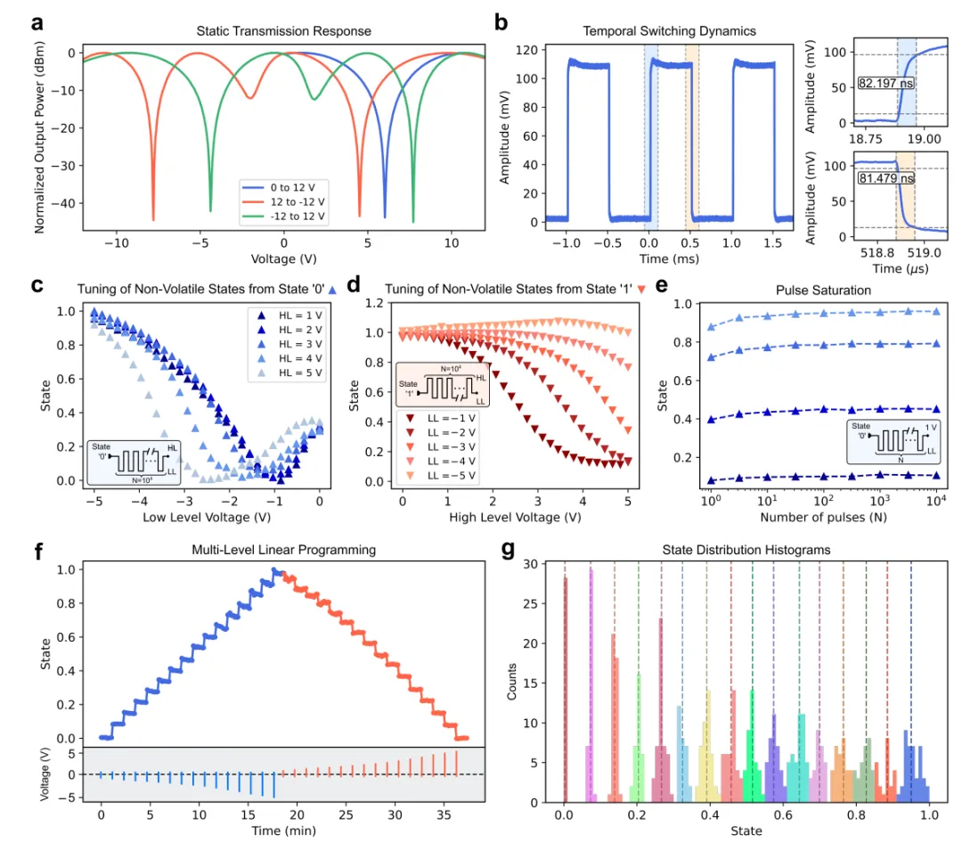 图2. NV-PUC的表征a. MZI的静态传输响应,显示了由于铁电域在直流电压扫描下重新定向而产生的典型蝴蝶形滞回回路。b. 时间开关动态,演示了约82纳秒的对称上升和下降时间,由泊克尔斯效应驱动。c, d. 通过施加具有不同低电平(LL)和高电平(HL)电压的脉冲序列,从状态“0”(c)和状态“1”(d)开始调节非挥发性状态。e. 状态饱和行为,作为施加脉冲数量(N)的函数,显示在超过102个脉冲后状态的稳定性。f. 多级线性编程,演示了具有16个不同相位级别的稳定“阶梯”响应。g. 从600次随机转换中获得的状态分布直方图,验证了16个可编程状态的准确性和可重复性。