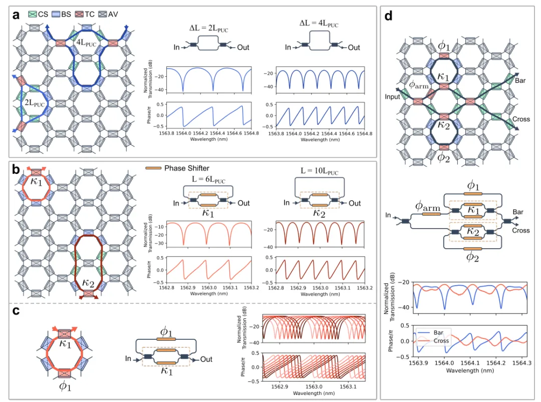 图3. 在六边形网格上实现可重构光学滤波器a. 合成的UMZI,路径长度差为 ( 2L_{PUC} ) 和 ( 4L_{PUC} ),显示了测量的归一化传输光谱和相位响应。b. 光学环谐振器,配置了腔体周长为 ( 6L_{PUC} ) 和 ( 10L_{PUC} )。c. IIR滤波器的可调性演示,通过独立控制PUC相位移器来调节共振峰。d. 一个复杂的二阶RAMZI滤波器的配置和测量的光谱响应。