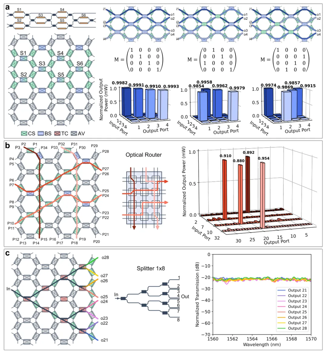 除了滤波应用外,我们还利用六边形波导网格实现了多功能的MIMO线性光学变换。网格的可编程性使其能够模拟多种连接方案,从单位矩阵运算到复杂的路由和广播网络。