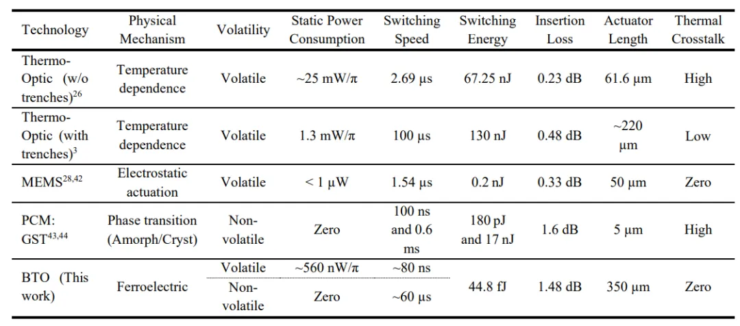 为了更好地理解铁电Si-BTO平台的性能,表1将我们的设备与当前用于可编程光子学的领先相位移技术进行了对比。