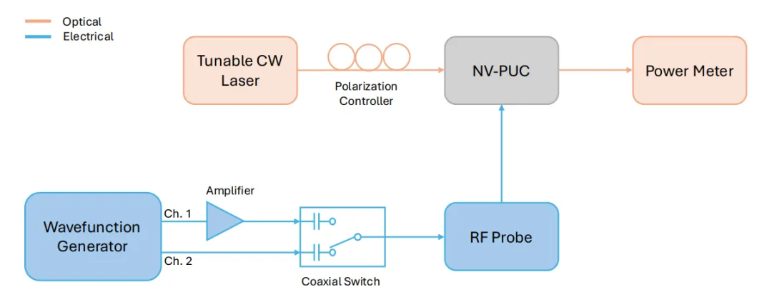 图S1. NV-PUC表征设置的示意图光学路径包括一个可调的连续波(CW)激光器、一个偏振控制器和一个功率计。电气驱动由双通道波形发生器管理;通道1(擦除)经过放大,而通道2(写入)则直接连接。一个同轴开关将适当的信号路由到射频探针,用于域擦除或状态设置。