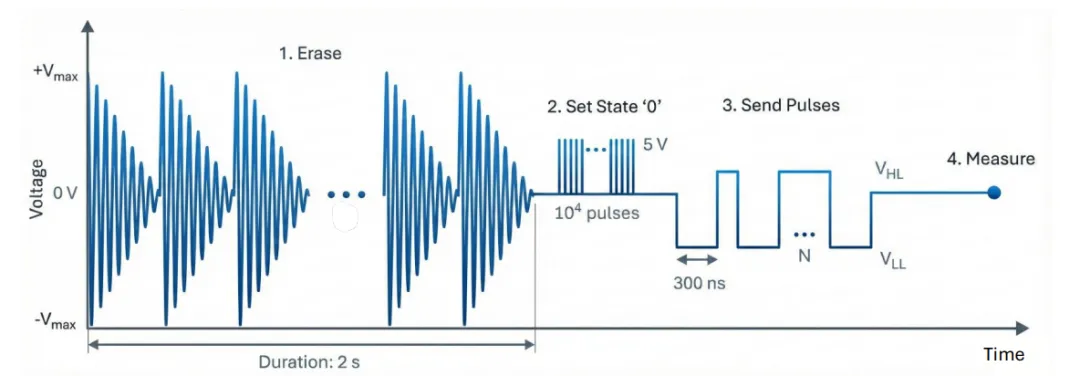 步骤 III:设置状态。 在设置初始饱和状态(0或1)之后,应用一组N个脉冲,每个脉冲的持续时间为300 ns(脉冲间隔同样为300 ns)。这些脉冲在特定的高电平(VHL)和低电平(VLL)振幅之间交替,以诱导部分开关。