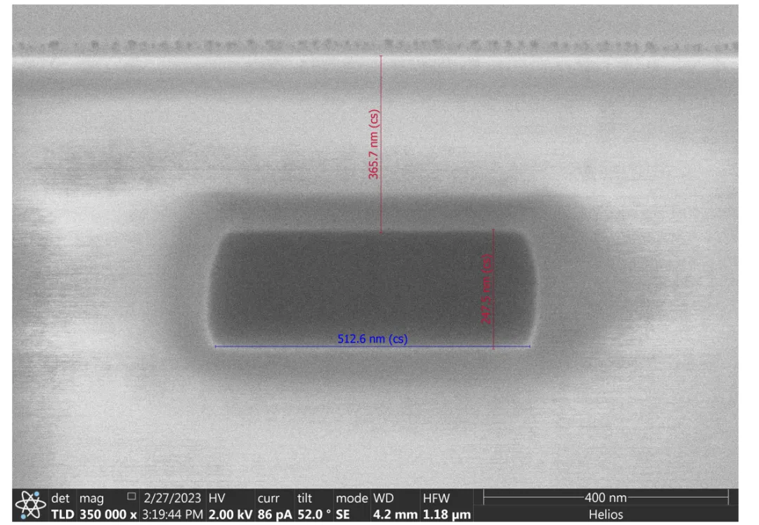 最终验证是通过扫描电子显微镜(SEM)对横截面进行的(图S7)。成像确认了坚固的矩形波导轮廓,核心宽度约为512.6 nm,高度为242.5 nm。此外,关键的顶部氧化物厚度测量为365.7 nm。该值略超出名义目标,但确保了足够的平面化余量,以便后续直接晶圆粘接BTO薄膜。