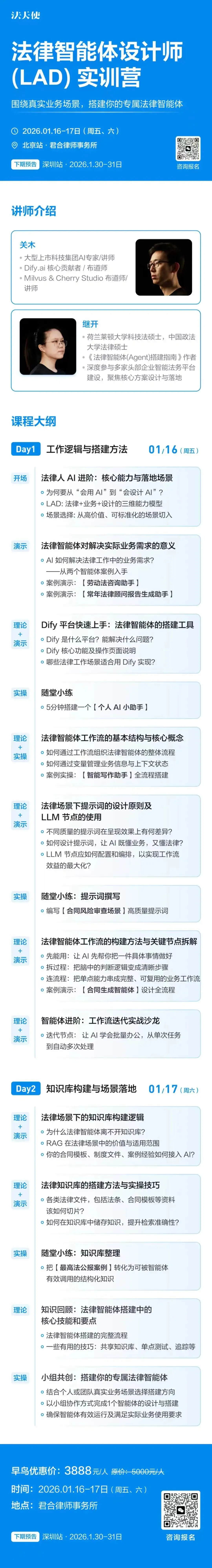 正在举办的「法律智能体设计师实训营」,是对这个趋势的响应。拥抱技术有很多方式,通过自学、看视频,自己研究是不错的方式;线下与同行聚在一起,交流实操也是一种方式。