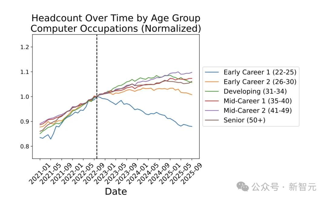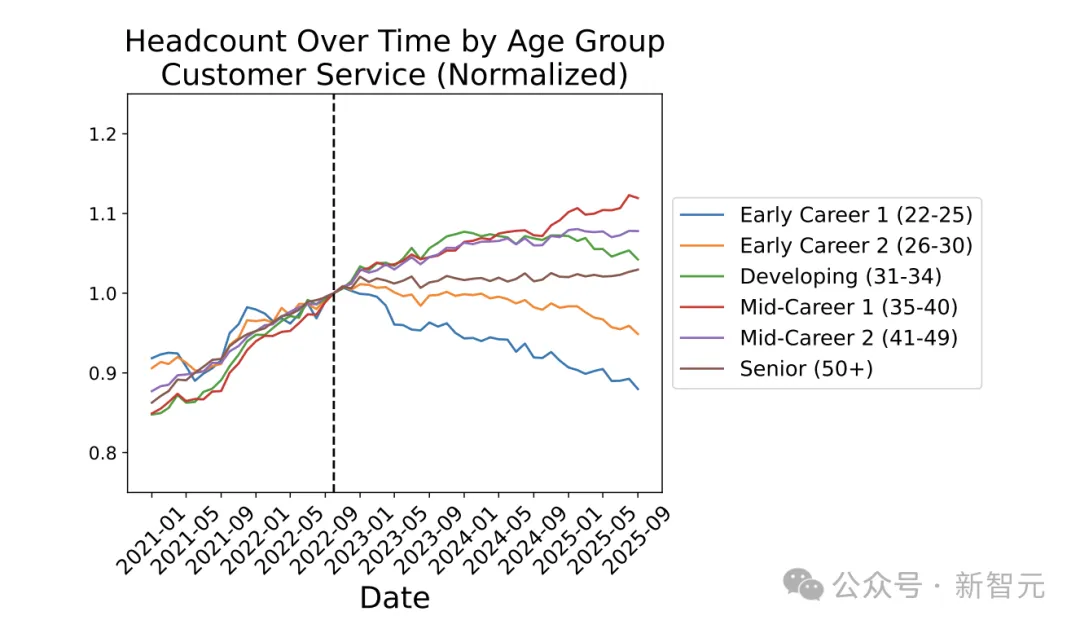 在最容易受AI影响的职业(比如软件工程师和客户服务)中,22岁至25岁的初入职场新人,其相对就业率在这一波AI浪潮中下降了13%。