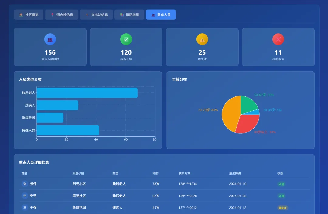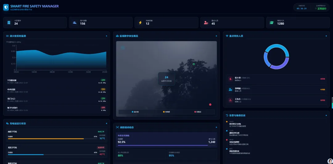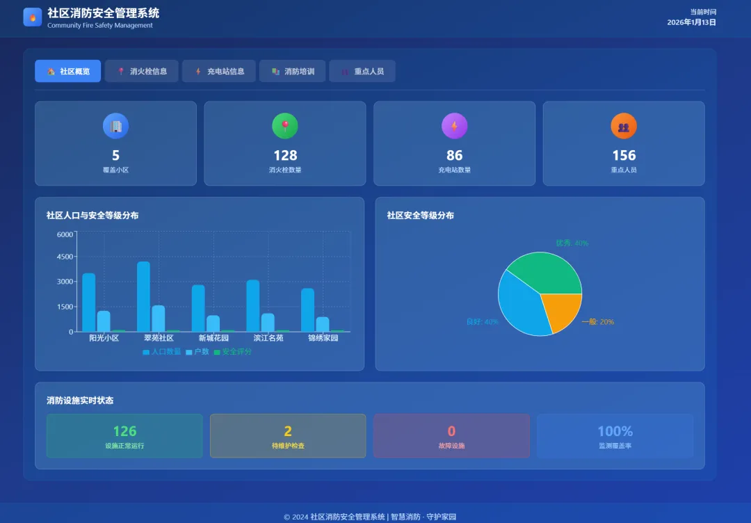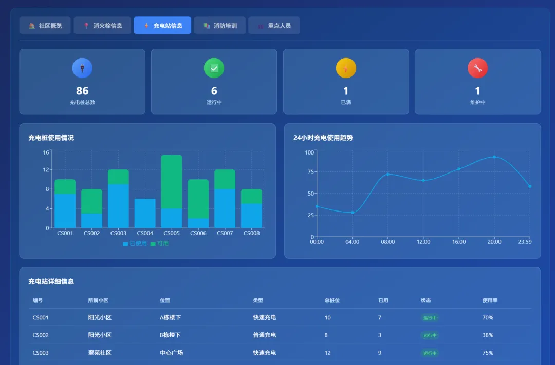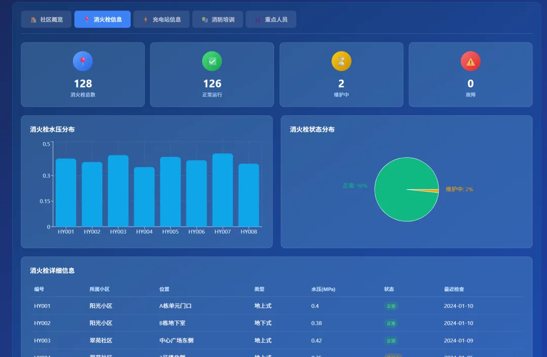原材料:一段简短的需求文字,生成一个社区消防安全管理网站,涵盖了小区信息、消火栓信息、充电站信息、消防培训、重点人员等情况,界面要高级感,可视化程度高,蓝色系背景。