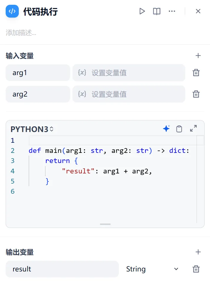 如下图所示,「代码执行」包括三个主要部分:输入变量,代码语法和输出变量。默认情况下,输入变量都会被冠以 arg1、arg2(以此类推)的名称。在代码语法中,将会以该显示名称代指各个输入变量。输出变量的默认名称是result。