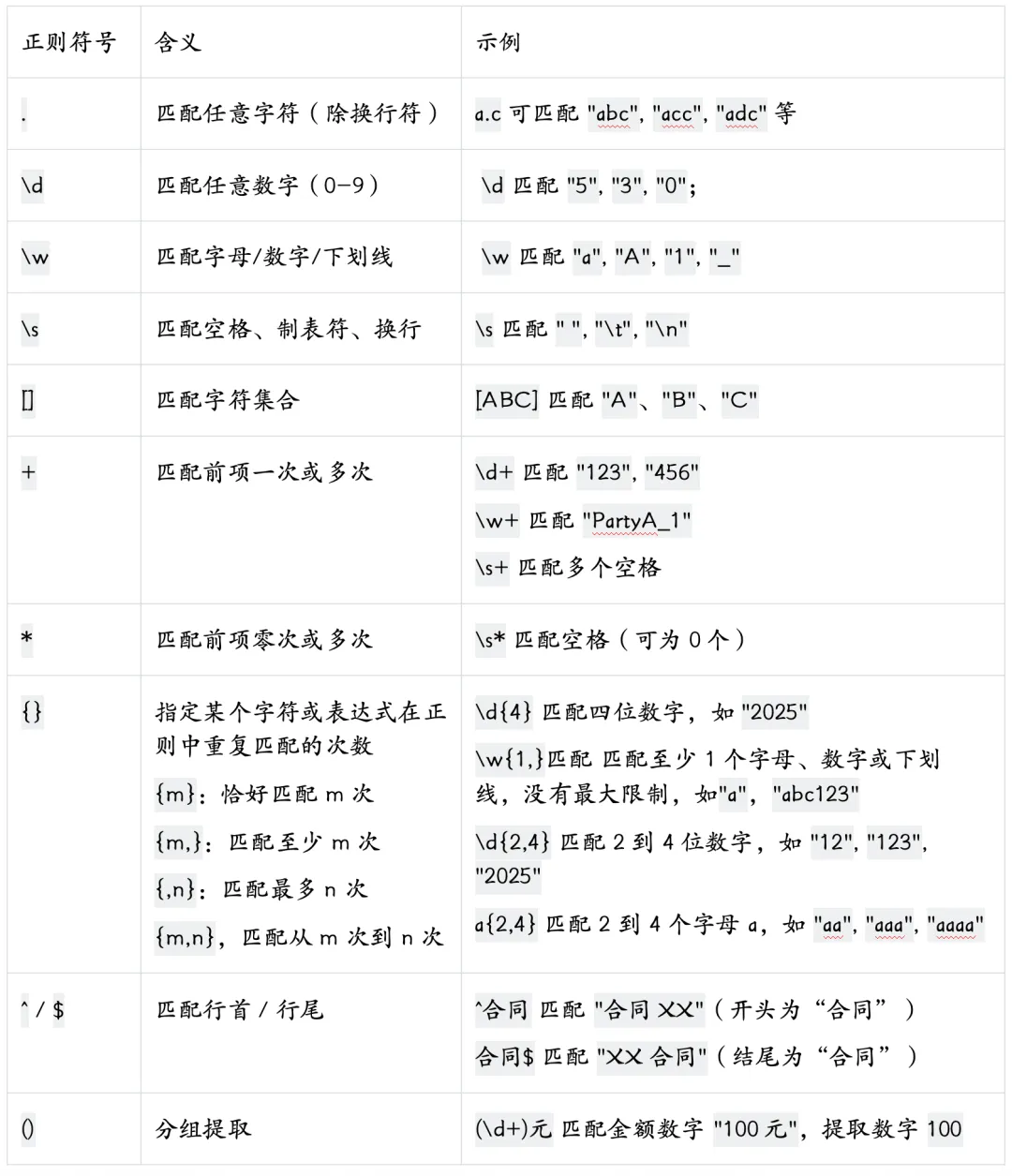 正则表达式(Regular Expression,简称 regex)是一种用于匹配、搜索和提取字符串中符合特定规则的文本的语法工具。它不像关键词匹配那样死板,也不需要调用大模型,可以在合同、法律文书、模型输出中精准提取结构化信息。