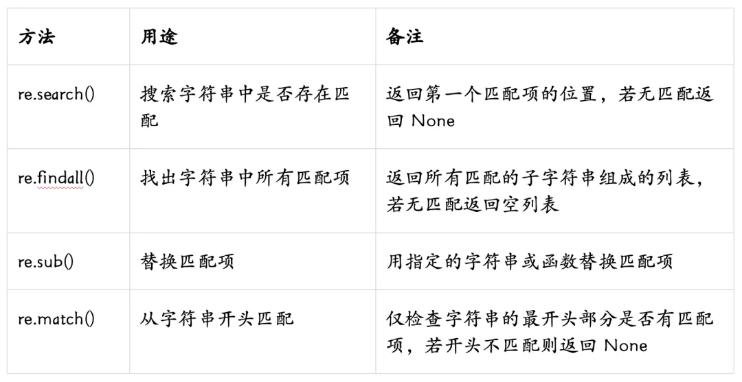 正则表达式在 Python 中通过 re 模块使用,主要方法有: