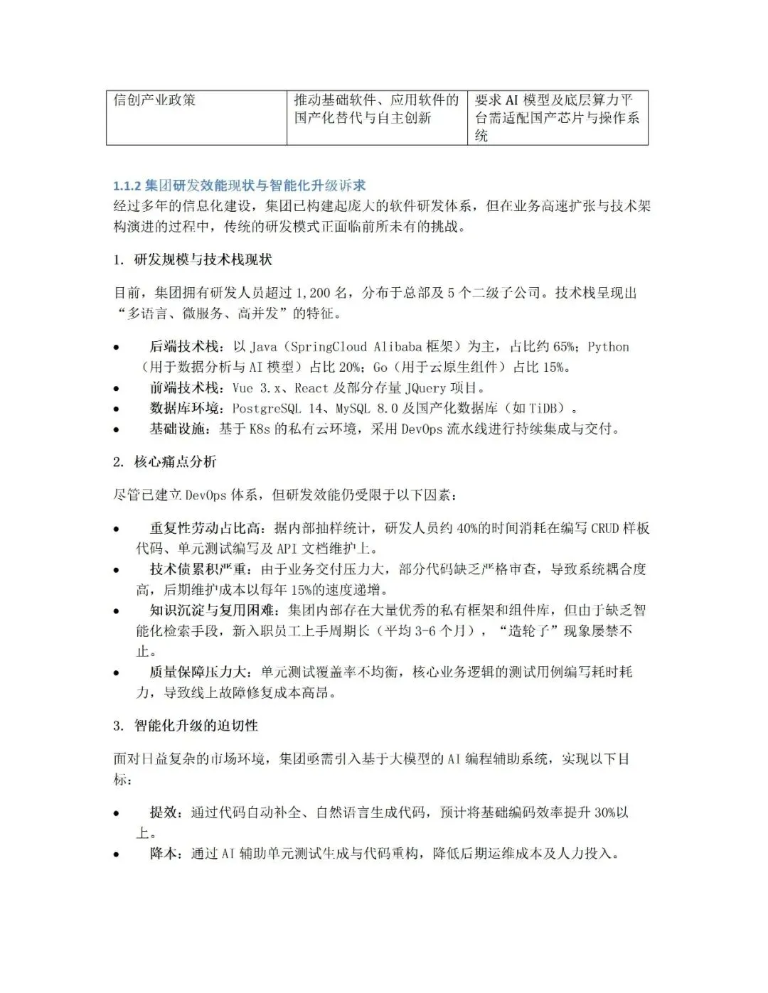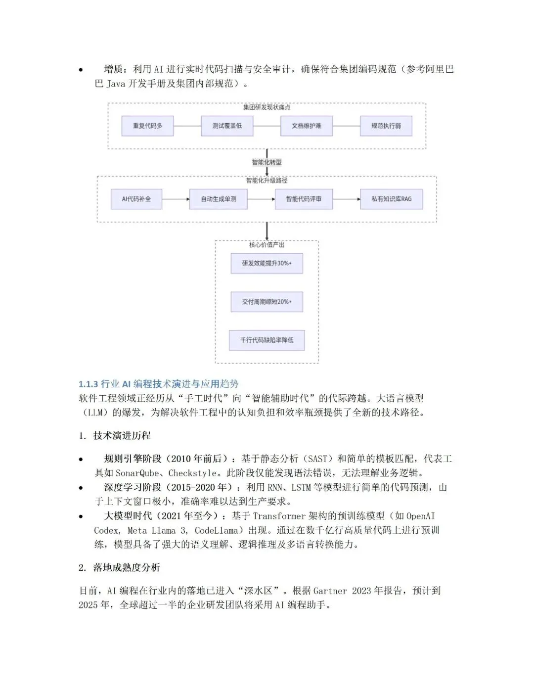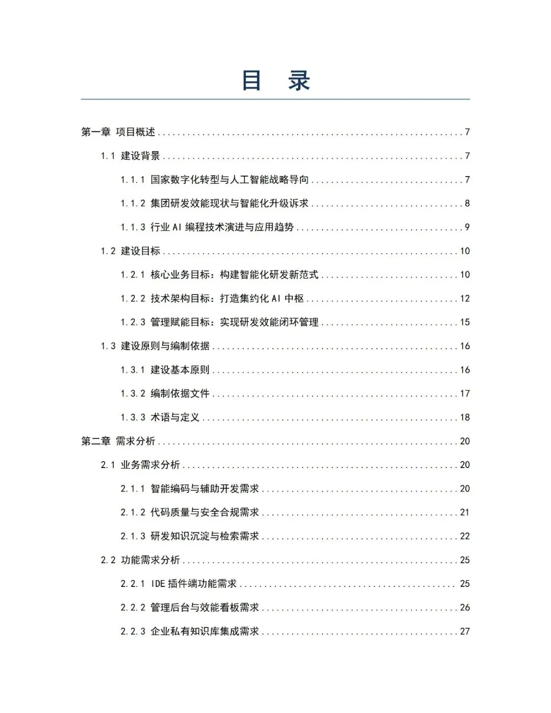 来源:无忧智库某大型集团的《AI编程助手与研发效能智能化平台建设方案》,内容非常扎实,几乎是一个完整的“企业级AI研发平台”落地蓝图。作为数字化顾问,我们经常被问到一个问题:“AI编程工具到底怎么在企业里用起来?”这份方案给出了一个系统性的回答——不只是工具,更是体系。今天,我就结合这份材料,聊几个值得我们思考和借鉴的关键点。一、AI编程助手不是“玩具”,而是“生产力系统”很多人以为,AI编程助手就是装个Copilot插件,写代码快一点。但这份方案从一开始就定位为“研发效能智能化平台”,这意味着它不只是个人工具,而是组织级的效率引擎。企业引入AI编程,目标不是让程序员“偷懒”,而是重构研发流程。方案中明确提出了“智能化研发新范式”,从代码补全、智能评审、知识检索到效能度量,形成一个闭环。这才是AI在企业中的正确打开方式——不是点状应用,而是系统赋能。如果你在推动企业AI落地,不妨先问:我们是要解决某个具体问题,还是要升级整个研发体系?后者需要顶层设计,包括组织、流程、工具的三位一体。二、私有化部署 + RAG:解决“企业知识”与“数据安全”两大痛点方案中反复强调“私有化部署”和“RAG(检索增强生成)技术”。这恰恰击中了企业最关心的两个问题:数据不出域和模型不懂业务。通用大模型再强,也不知道你公司内部的业务逻辑、技术框架和历史代码。RAG通过向量化检索企业内部知识库,让AI在生成代码时“有据可依”,大幅减少“幻觉”。同时,私有化部署确保代码资产不被泄露,符合等保三级要求。企业AI落地,安全与合规是底线。建议在选型时优先考虑支持私有化部署和RAG架构的平台,同时尽早启动内部知识库的梳理与向量化工作。三、效能度量不是“看报表”,而是“驱动优化”方案中有一章专门讲“研发效能度量与分析看板”,不仅提到DORA指标,还结合了SPACE框架。这说明什么呢?——效能提升不能凭感觉,必须可量化、可分析、可优化。很多企业上了DevOps工具,却只停留在“看板可视化”,没有形成决策依据。这份方案把AI生成代码的采纳率、留存率、缺陷密度等指标全部纳入度量体系,从而实现“数据驱动研发改进”。如果你正在做研发效能提升,建议建立“指标—采集—分析—行动”的闭环。指标不宜过多,但必须与业务目标对齐,比如交付速度、质量、成本。四、组织与文化变革,比技术更重要方案中专门设置了“变革管理风险与应对措施”一节,提到开发者可能抵触、学习成本高、流程不适应等问题。这说明项目组深刻意识到:技术好推,人心难改。AI工具的推广,本质是一场组织变革。需要配套的培训、激励、流程调整,甚至岗位职责的重新定义。方案中建议“AI初审+人工复核”的代码评审模式,就是一种渐进式融合策略。推动任何数字化转型,都不要忽略“人”的因素。早期可以通过试点团队、内部案例分享、技术沙龙等方式逐步建立信心和习惯。五、从“项目”到“平台”,从“功能”到“生态”这份方案不是一次性项目,而是分三阶段推进:平台搭建→全面推广→生态建设。尤其在第三阶段,提到“Prompt共享仓库”“内部社区”“AI编程大赛”等,这是典型的平台思维和生态运营。一个好的企业级平台,不仅要能用,还要能生长。通过运营机制激发内部共创,才能形成持续进化的能力。如果你在规划企业级平台,不妨预留一些“共创接口”——比如插件机制、API开放、社区板块,让用户也能成为建设者。结语:AI不是替代人,而是增强人这份方案最后提到:“AI的定位是‘副驾驶’,而非‘驾驶员’。”这句话很重要。它提醒我们,无论技术多先进,核心依然是人——人的决策、人的创意、人的责任。作为数字化顾问,我们常常在“技术可能性”与“组织现实性”之间寻找平衡。这份方案提供了一个很好的范本:既有前沿技术架构,也有扎实的管理设计;既有量化目标,也有文化考量。如果你也在为企业寻找AI研发落地的路径,不妨参考这样一个思路:以体系支撑工具,以数据驱动改进,以文化保障落地。真正的数字化转型,从来不只是技术的升级,更是组织能力的重塑。【未完...】