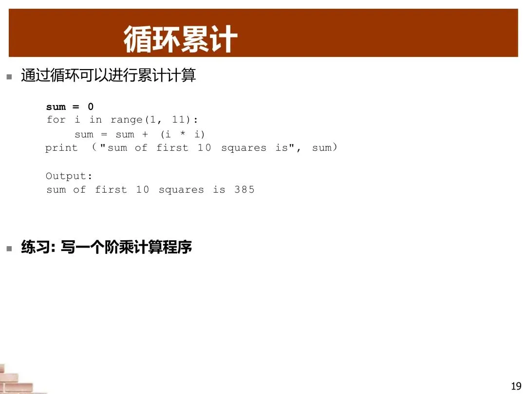 循环不仅可以执行重复操作,还可以进行累加计算。这是编程中的一个重要模式:初始化一个累加器变量,然后在循环中不断更新它的值。例如,我们可以计算前10个自然数的平方和。这种模式在数据处理、统计分析和算法实现中无处不在。掌握循环累加技巧是成为合格程序员的重要一步,它让我们能够解决各种求和、求积、计数等问题。