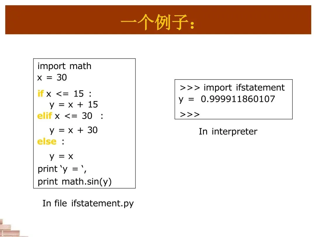 让我们通过一个实际例子来看看条件语句如何工作。假设我们需要根据x的值计算y:如果x小于等于15,y等于x加15;如果x在15到30之间,y等于x加30;否则y等于x。然后我们计算y的正弦值。这个例子展示了如何将数学函数与条件逻辑结合,解决实际问题。在科学计算和工程应用中,这种模式非常常见。