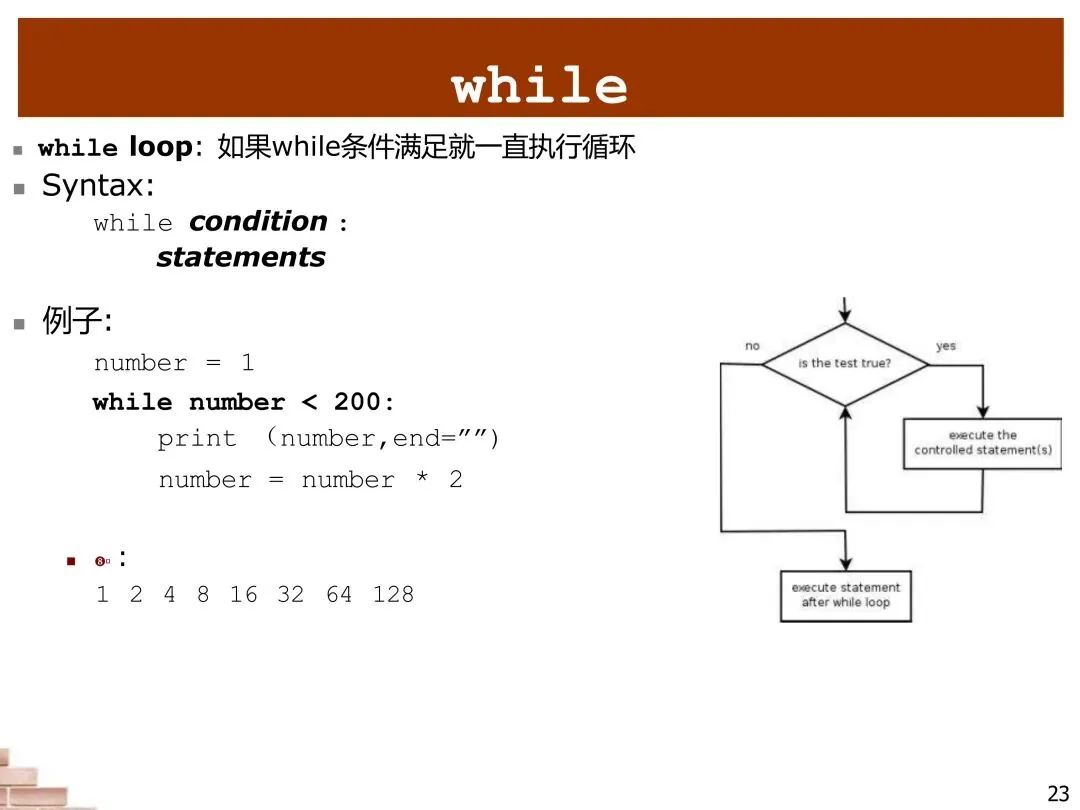理解while循环的执行流程很重要。首先,程序检查条件是否为真;如果为真,执行循环体内的代码;执行完毕后,再次检查条件;这个过程一直重复,直到条件变为假。我们需要在循环体内改变某些变量的值,使条件最终变为假。例如,在打印2的幂次直到超过200的例子中,我们在每次循环中将数字乘以2,最终使条件“数字小于200”不再成立。