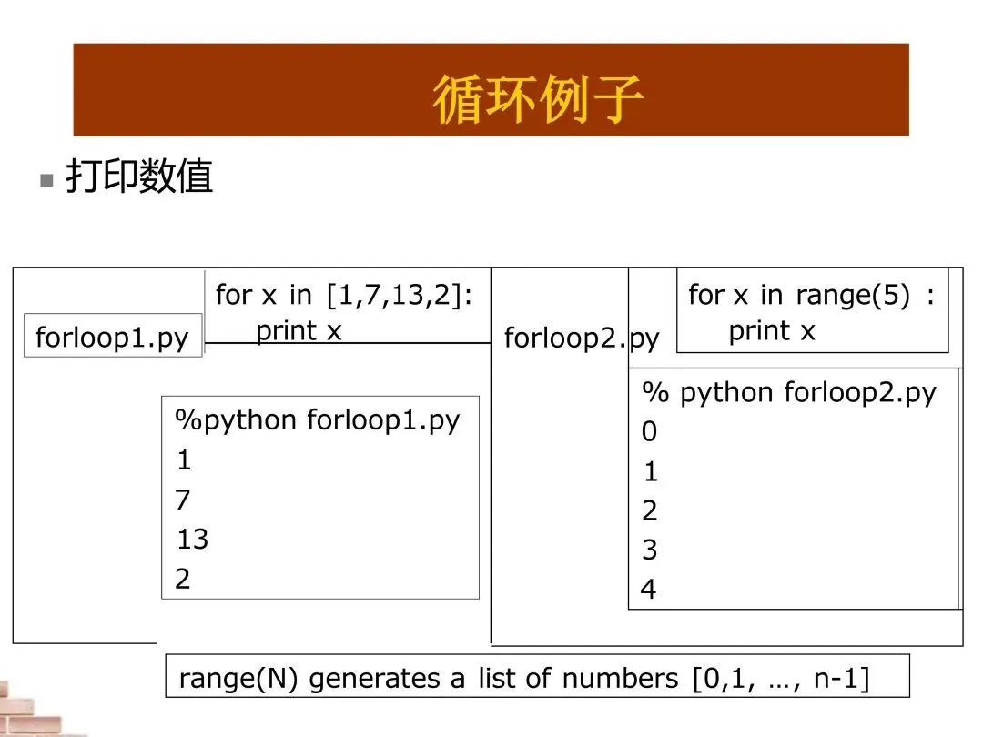 让我们看一些循环的实际例子。for循环可以直接遍历列表中的元素,如[1,7,13,2]中的每个数字。我们也可以使用range()函数生成数字序列,如range(5)生成0到4的整数。range(N)生成从0到N-1的整数序列,这是Python中的常见模式。通过这些例子,我们可以看到循环如何简化重复任务,使代码更加简洁和易维护。