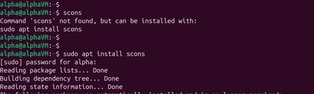 SCons 依赖 Python,Ubuntu 24.04 默认安装了 Python 3.12,满足安装使用 SCons 的环境要求,故直接安装 SCons 即可: