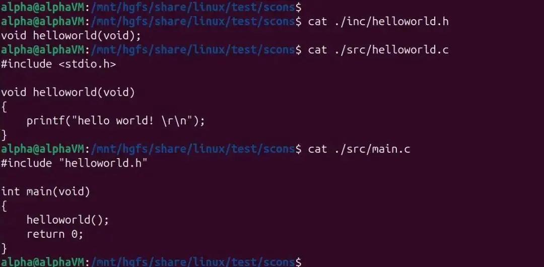 // helloworld.hvoidhelloworld(void);// helloworld.c#include<stdio.h>voidhelloworld(void){printf("hello world! \r\n");}// main.c#include"helloworld.h"intmain(void){ helloworld();return0;}