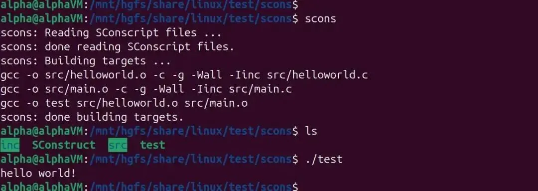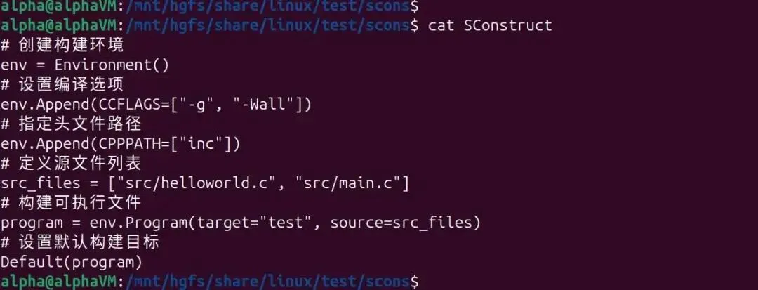 # 创建构建环境env = Environment()# 设置编译选项env.Append(CCFLAGS=["-g", "-Wall"])# 指定头文件路径env.Append(CPPPATH=["inc"])# 定义源文件列表src_files = ["src/helloworld.c", "src/main.c"]# 构建可执行文件program = env.Program(target="test", source=src_files)# 设置默认构建目标Default(program)