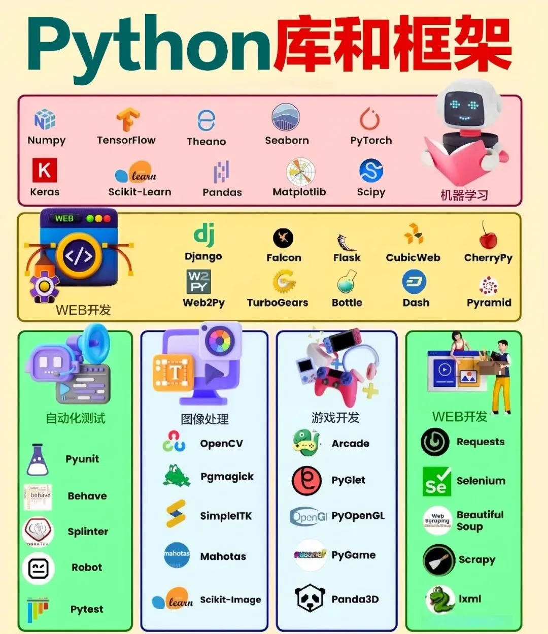 我为您精心整理了一张清晰的分类导图,涵盖 Web开发、数据科学、机器学习、图像处理、自动化测试、网络爬虫、游戏开发、自动化运维与加密 等多个实战领域。图中收录的每一个库,都是经过全球开发者反复验证、在项目中脱颖而出的顶尖工具。