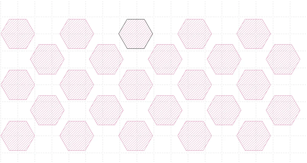import pyaimport mathdef create_hexagon(center_x, center_y, radius): """Create a single hexagon""" points = [] for i in range(6): angle = 2 * math.pi * i / 6 x = center_x + radius * math.cos(angle) y = center_y + radius * math.sin(angle) points.append(pya.Point(int(x * 1000), int(y * 1000))) return pya.Polygon(points)# Create layoutlayout = pya.Layout()layer_index = layout.insert_layer(pya.LayerInfo(1, 0))cell = layout.create_cell("TOP")# Hexagon parametersradius = 0.5 # Hexagon radiusspacing = radius * 1.8 # Spacing between hexagons# Create hexagon arrayrows = 5cols = 5for row in range(rows): for col in range(cols): # Calculate hexagon center position (staggered arrangement) if row % 2 == 0: x = col * (radius * 1.732) * 2 # 1.732 = √3 else: x = (col + 0.5) * (radius * 1.732) * 2 y = row * radius * 1.5 hexagon = create_hexagon(x, y, radius) cell.shapes(layer_index).insert(hexagon)# Save filelayout.write("hexagon_array.gds")