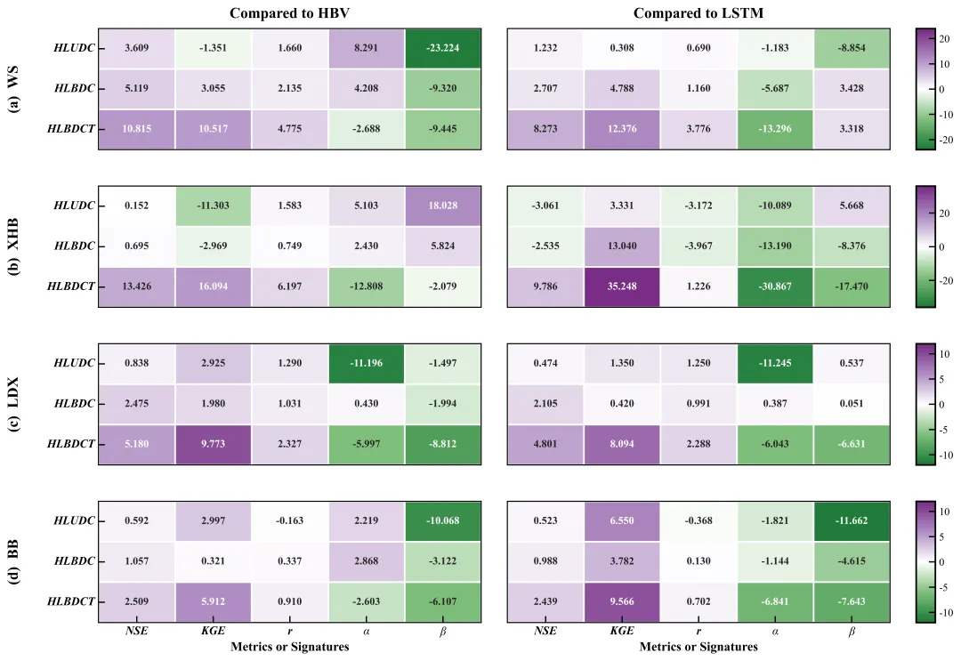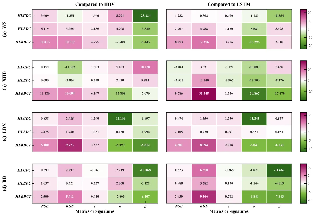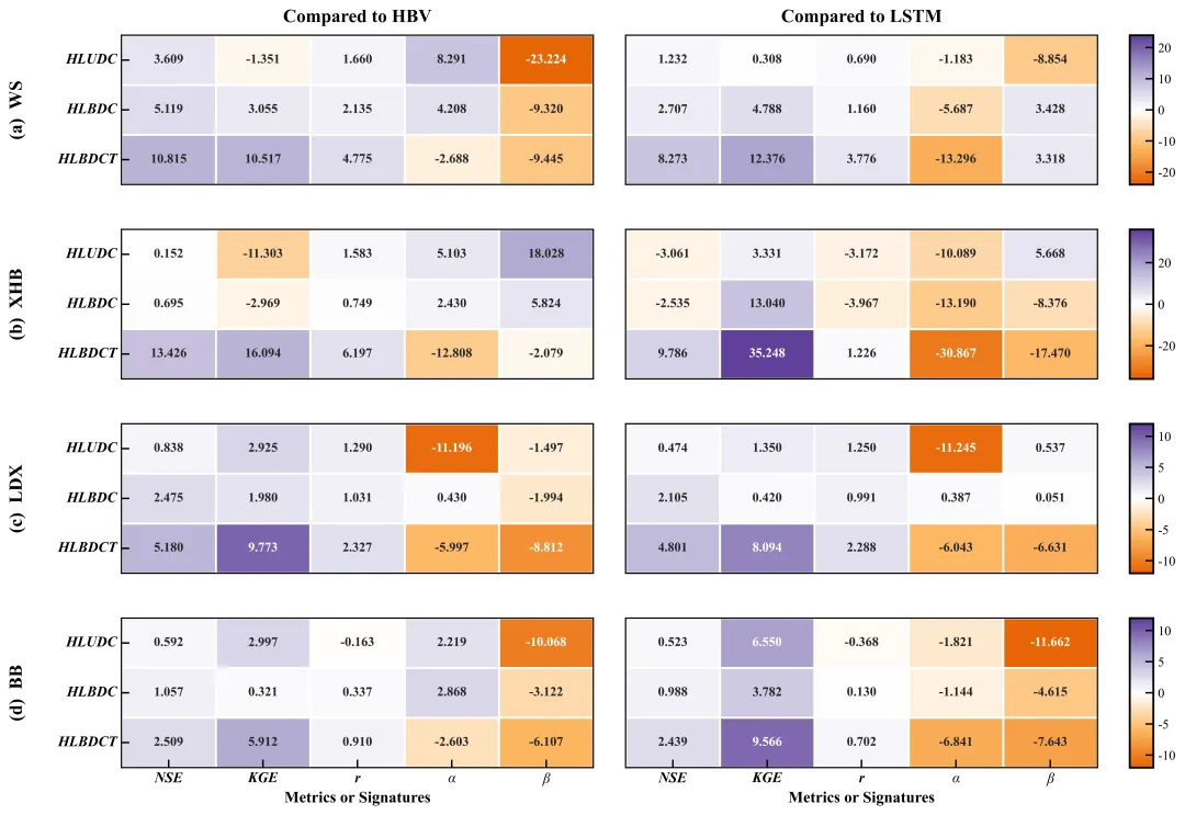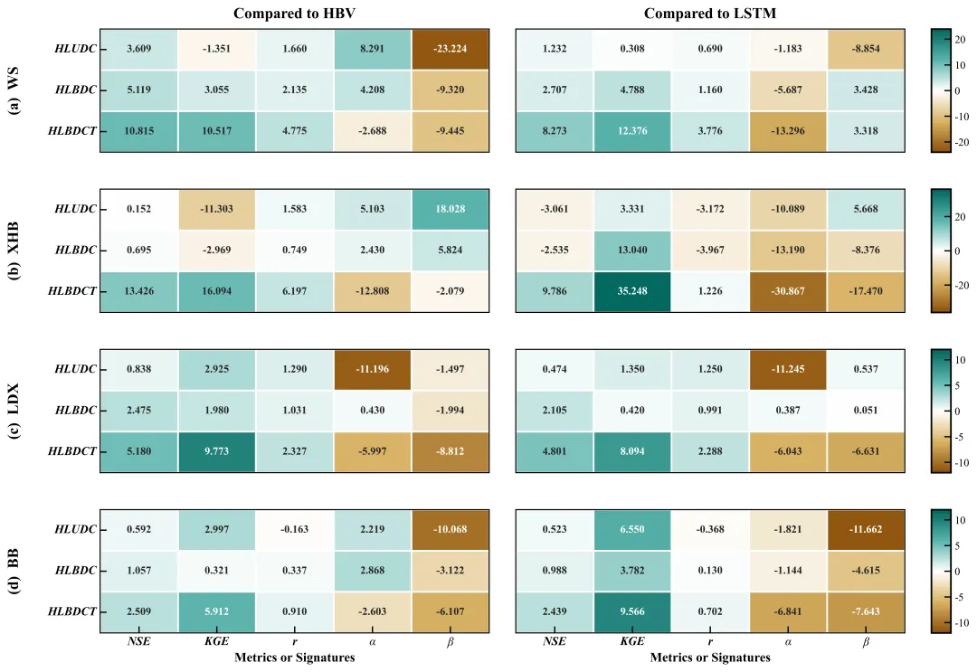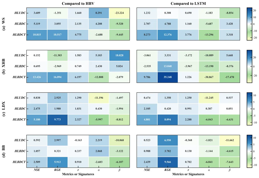 读图逻辑:颜色越蓝,说明相对于基准模型(HBV 或 LSTM)的提升越大。