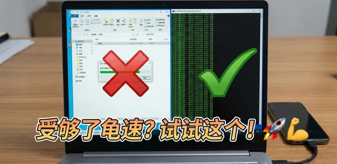 想把手机里积攒了一两年的照片、视频导出来备份到电脑硬盘。满怀期待地插上数据线,打开DCIM文件夹,Ctrl+C,Ctrl+V……Windows 的资源管理器卡住了,弹出一个窗口提示**“正在计算复制文件所需的时间”**。一分钟过去了,五分钟过去了,它还在计算。好不容易开始复制了,速度只有可怜的十几MB/s,还得祈祷中间别报错,一旦断开连接,一切重来。今天,我们彻底解决这个问题。放弃低效的 MTP 协议,我们用安卓开发者的原生工具ADB,配合一段自动化的Python脚本,实现极速、稳定、可断点续传的全盘备份。为什么这个方案更强?