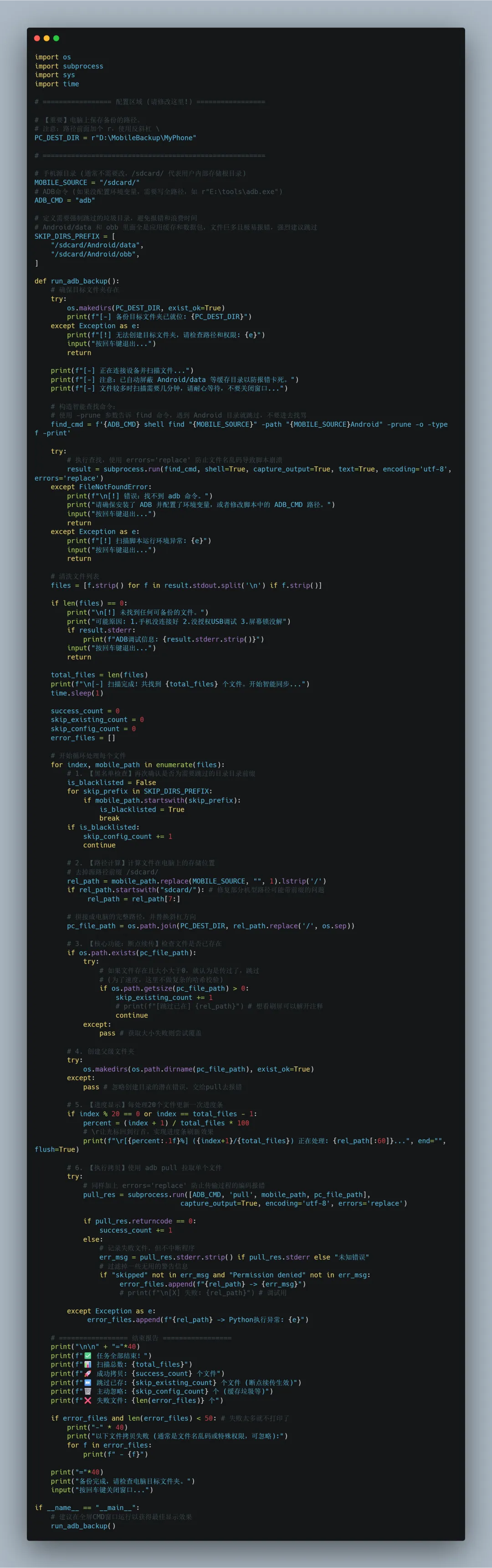 这个脚本的核心是利用了 ADB (Android Debug Bridge) 的直接传输能力,并用 Python 加上了智能逻辑。✅拒绝龟速预计算:直接扫描文件列表并开始拉取,跳过 Windows 漫长的索引过程,速度跑满 USB 带宽。✅支持断点续传(核心杀手锏):这是最爽的一点!如果备份到一半不小心断了,或者今天没传完。下次运行脚本时,它会自动识别并跳过电脑上已经存在的文件,只传新的!✅智能避坑:自动跳过 Android/data 等包含数万个小文件且极易报错的系统缓存目录,确保备份过程不卡死。✅无需Root:任何开启了开发者选项的安卓手机都能用。