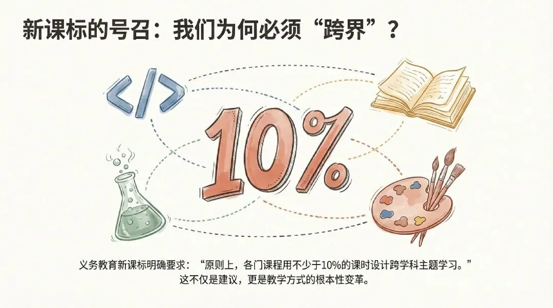 信息科技新课标明确要求:各学科至少用10%课时开展跨学科学习。这10%不是简单叠加,而是对教育本质的重新思考——现实世界的问题从不按学科划分,为什么我们的教学要?