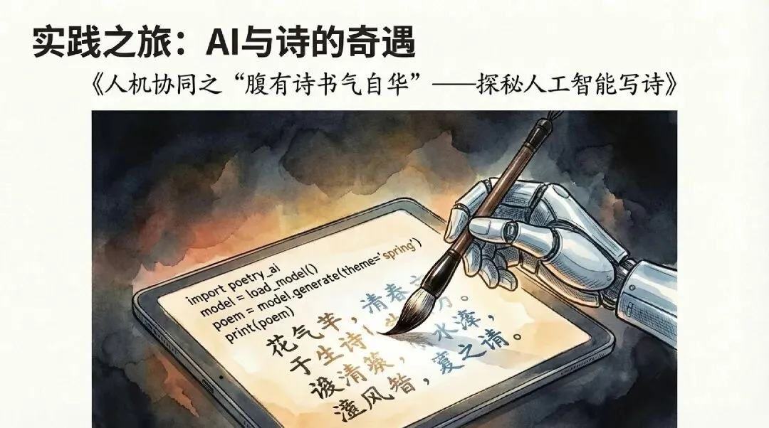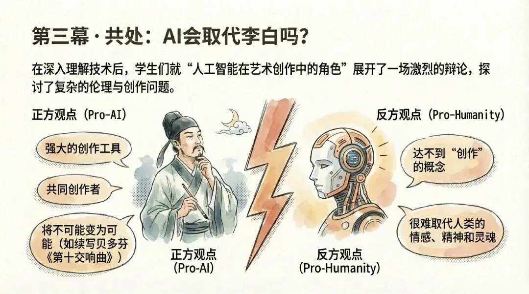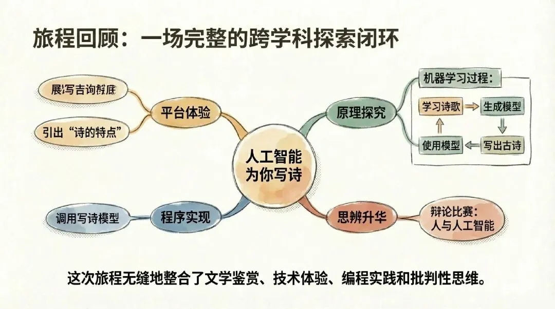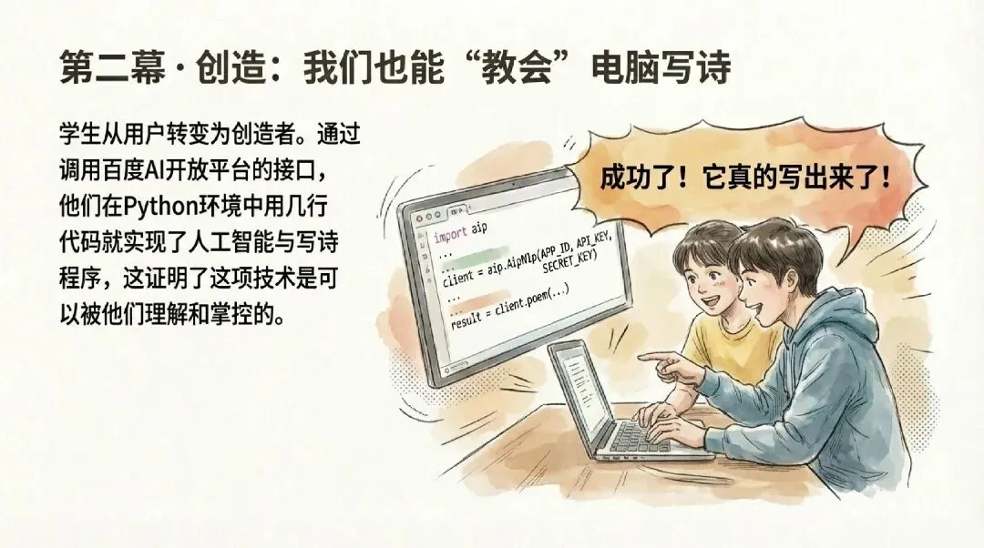 第三层:创造与思辨学生亲手编写代码调用AI接口,让程序“学会”写诗。随后展开辩论:“AI能取代诗人吗?”技术、文学、伦理在此交汇。