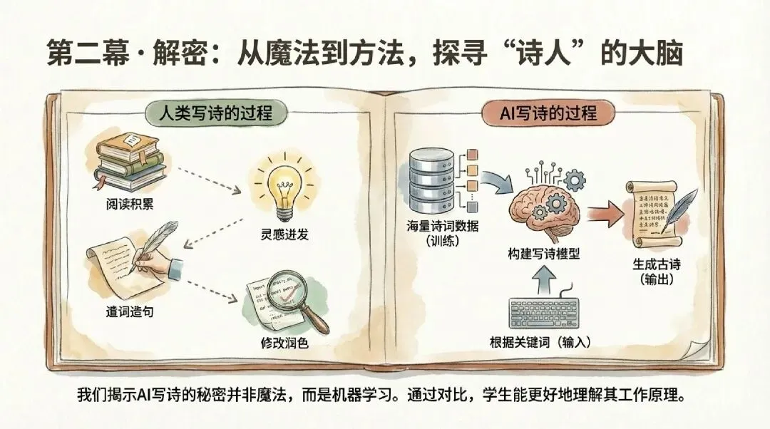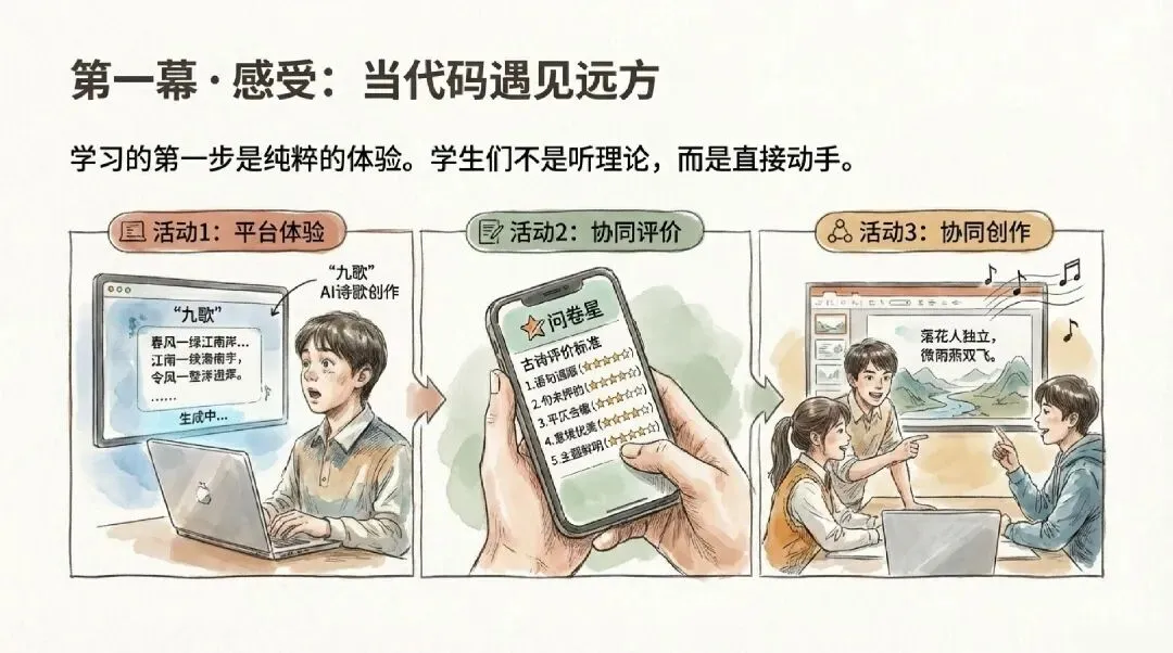 第一层:体验学生直接使用AI写诗平台,输入主题,即刻获得诗作。技术从抽象概念变为可感工具。